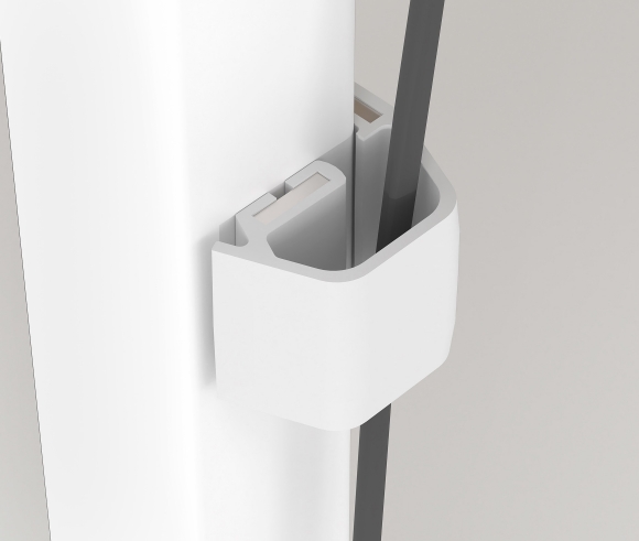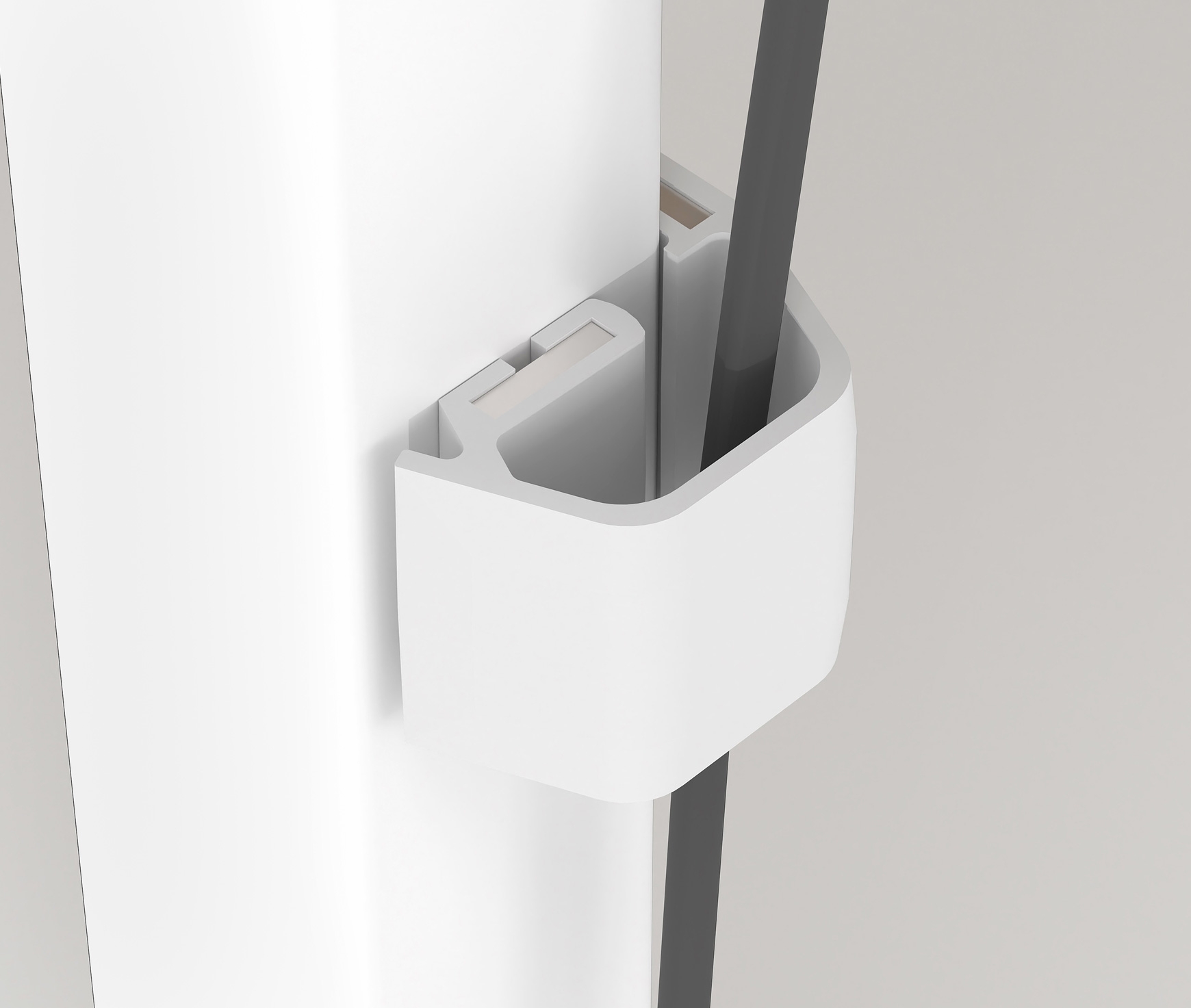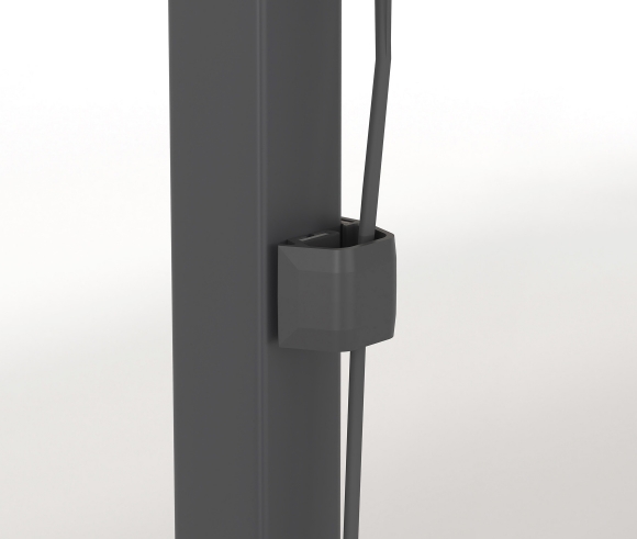 The magnetic cable grommet allows for efficient routing and bundling of cables. It has magnets for quick and easy application to the metal frame of the desk.
