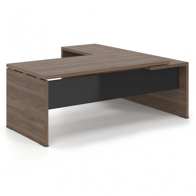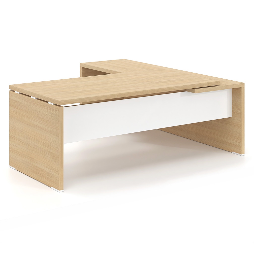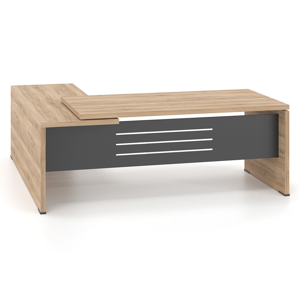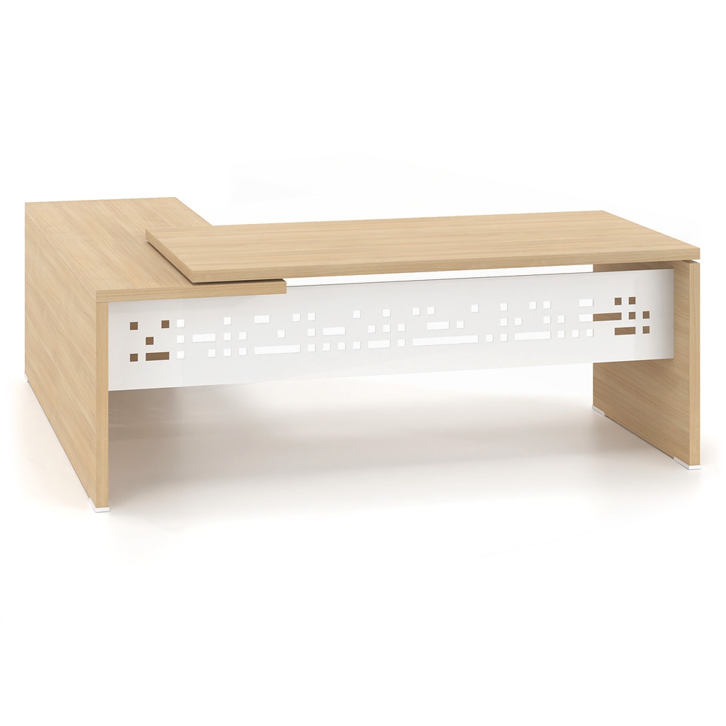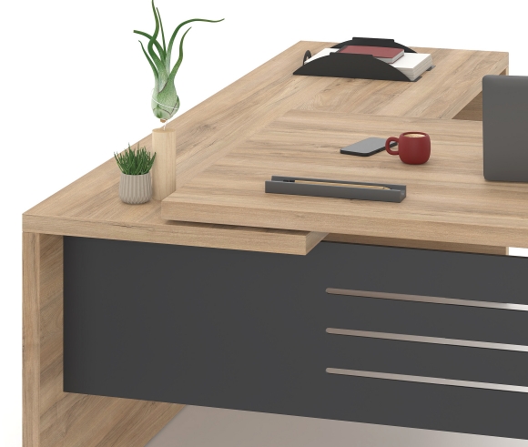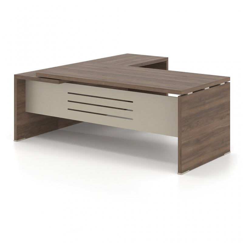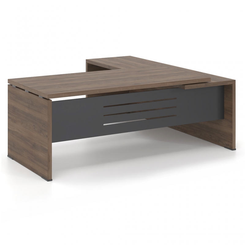 The Lysis Plus desk is made of 38mm chipboard lined with excellent quality melamine chipboard so that it can cope with the preferences of any demanding executive. At the same time, the modesty panel, which completes the dynamic appearance of the desk, is made of 1.5 mm thick metal or 25 mm melamine chipboard in the color of your choice. Alternatively, the modesty panel is lined with a 4 mm thick glass surface or with lacquer. In addition, the extension that can be integrated into the desk with the optional 4 mm thick glass surface creates a unique, ergonomic executive desk of high aesthetics. The overall functionality of the desk is completed by the optional rosette, painted or nickel-plated, and the cable passage channel placed under the surface.