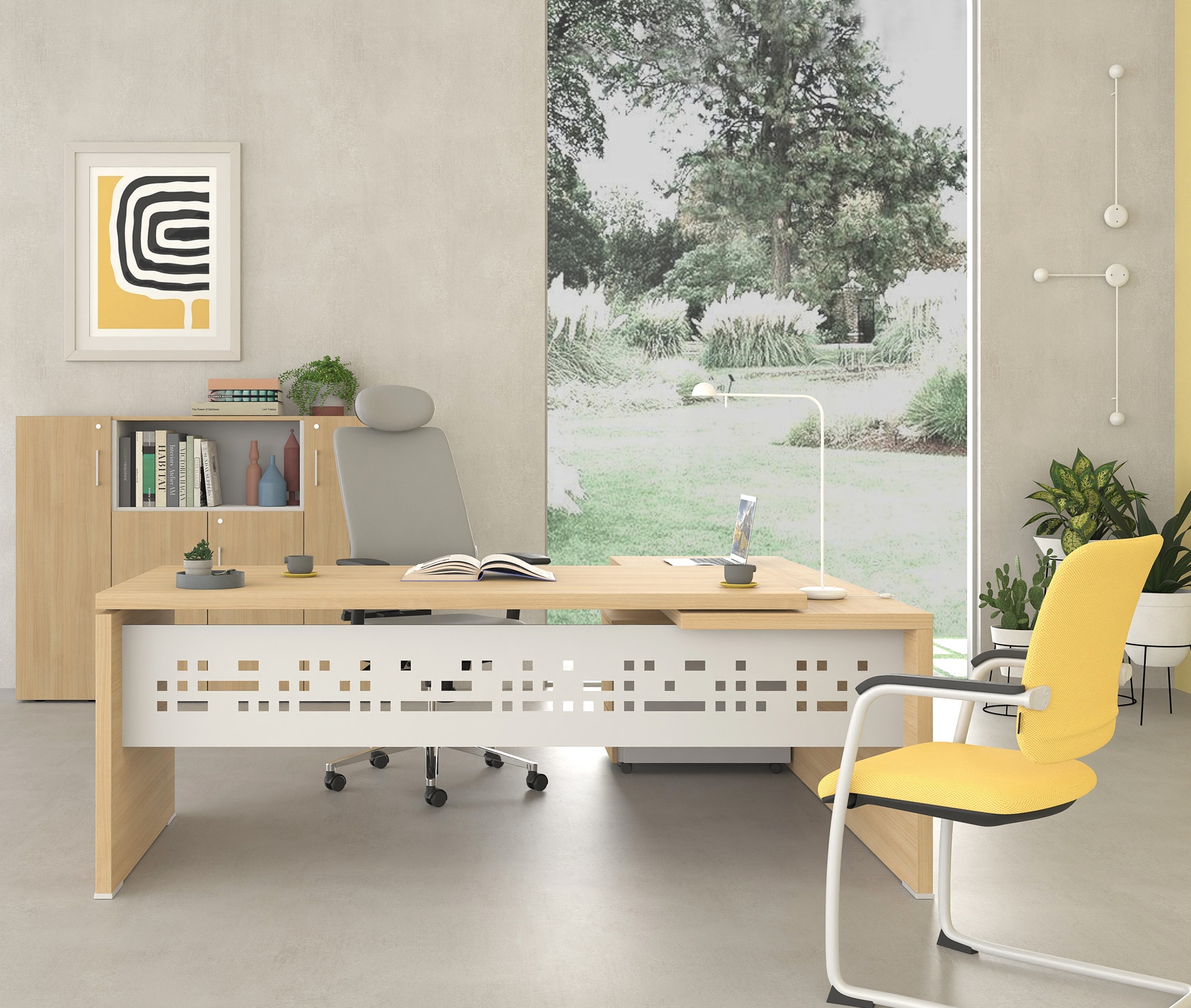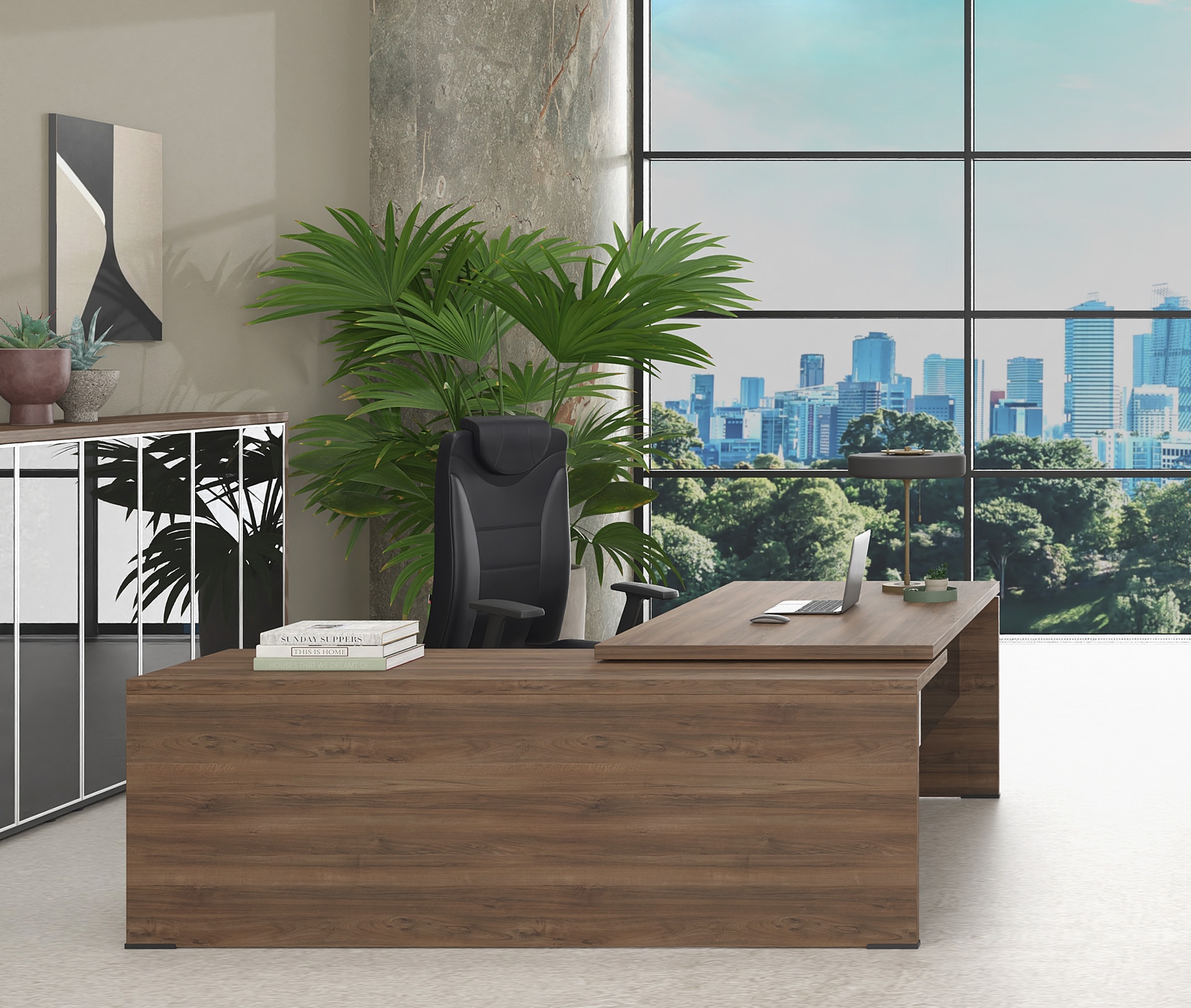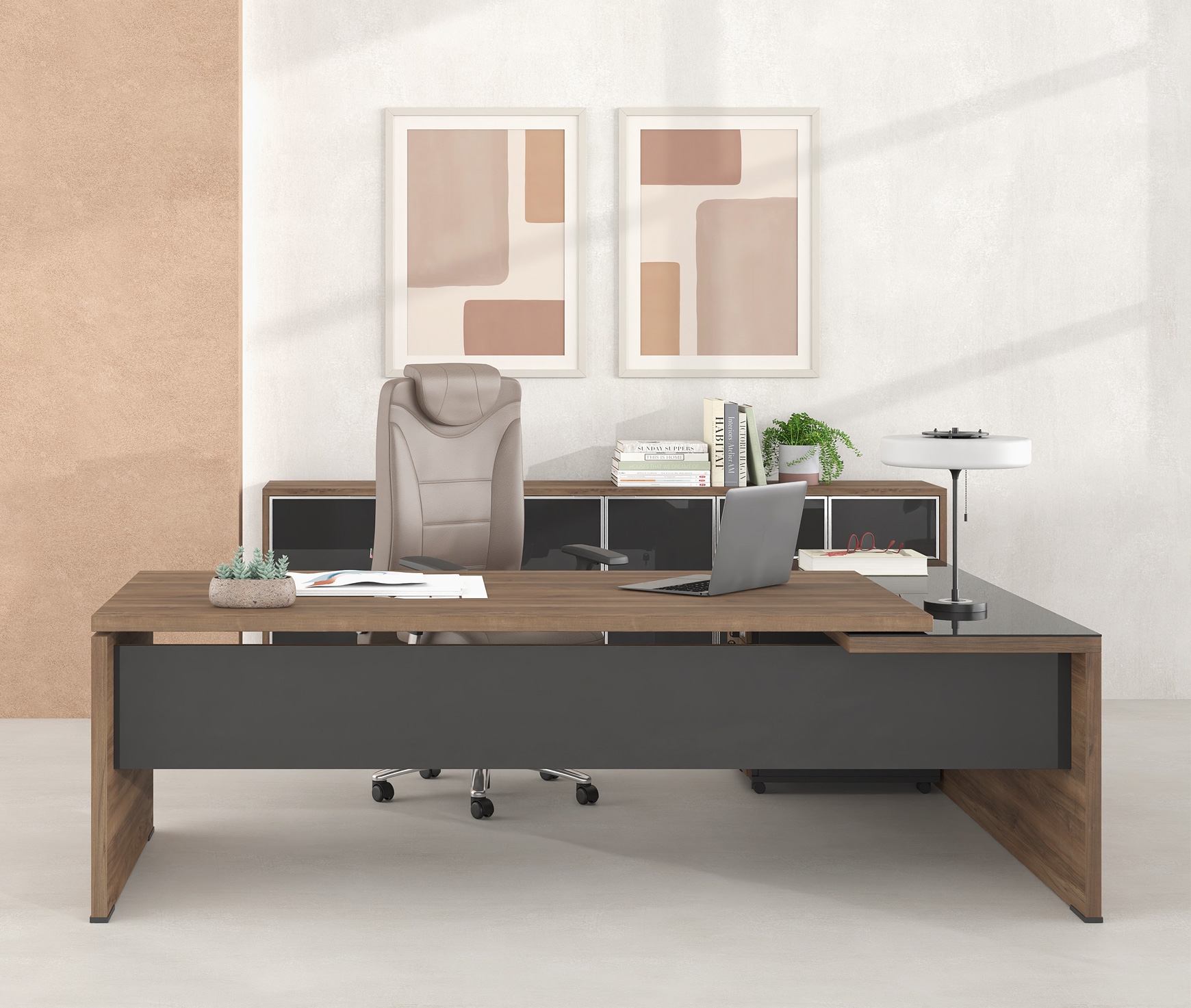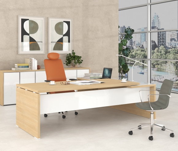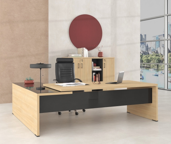 Affordable luxury and versatility are the irresistible features of the LYSIS PLUS executive series. The wide range of options for the composition of the office gives an air of uniqueness to you and your space. LYSIS PLUS can be a composite of melamine chipboard with glass or metal. The different materials blend together harmoniously, giving a distinctive style to the work environment