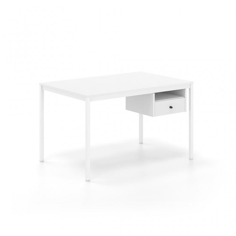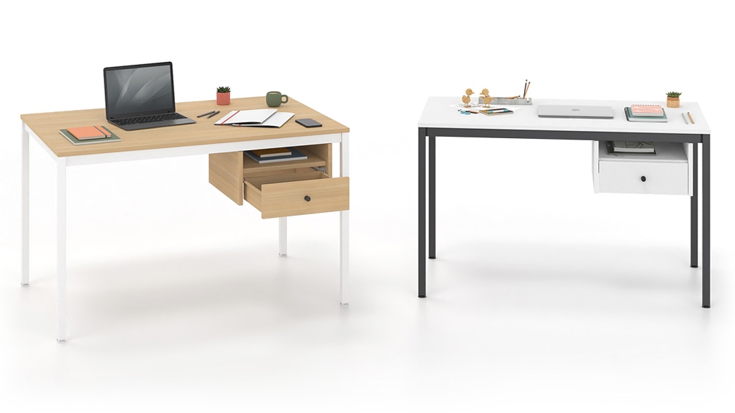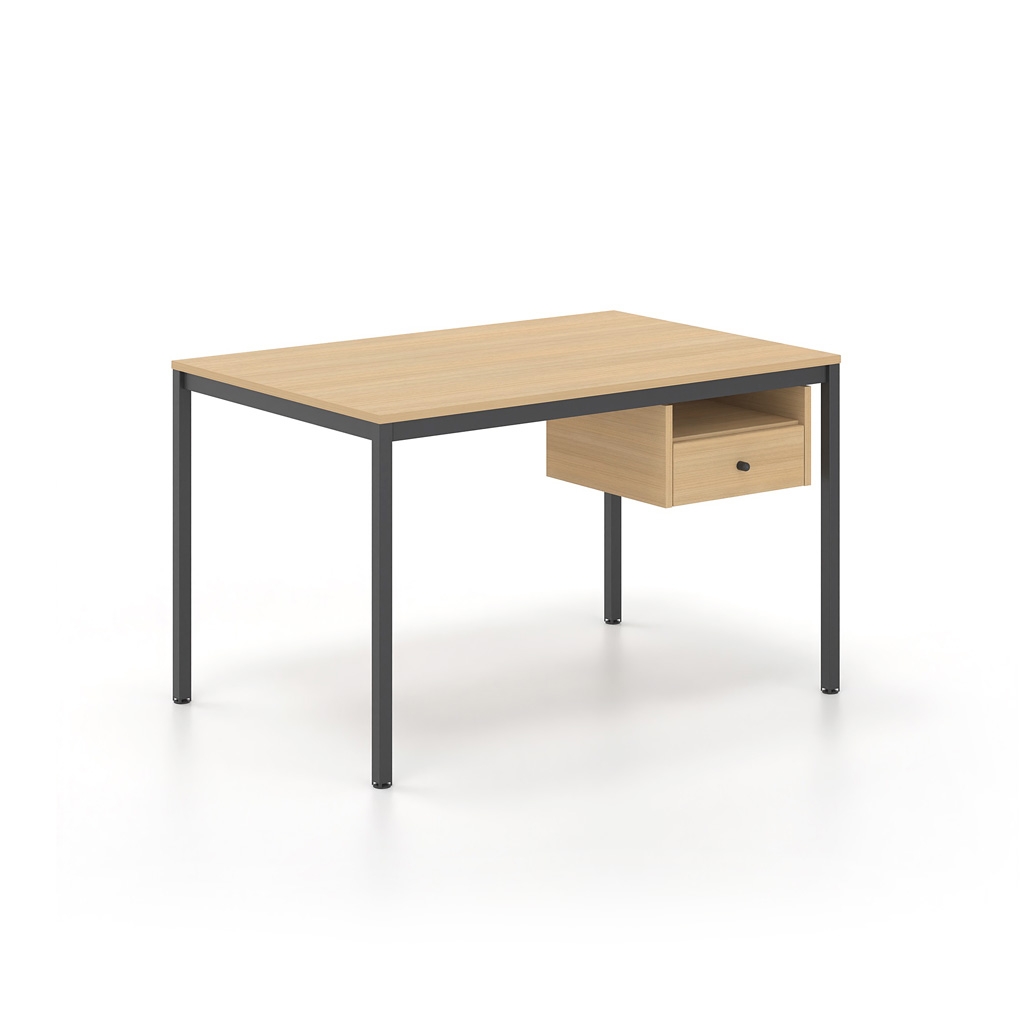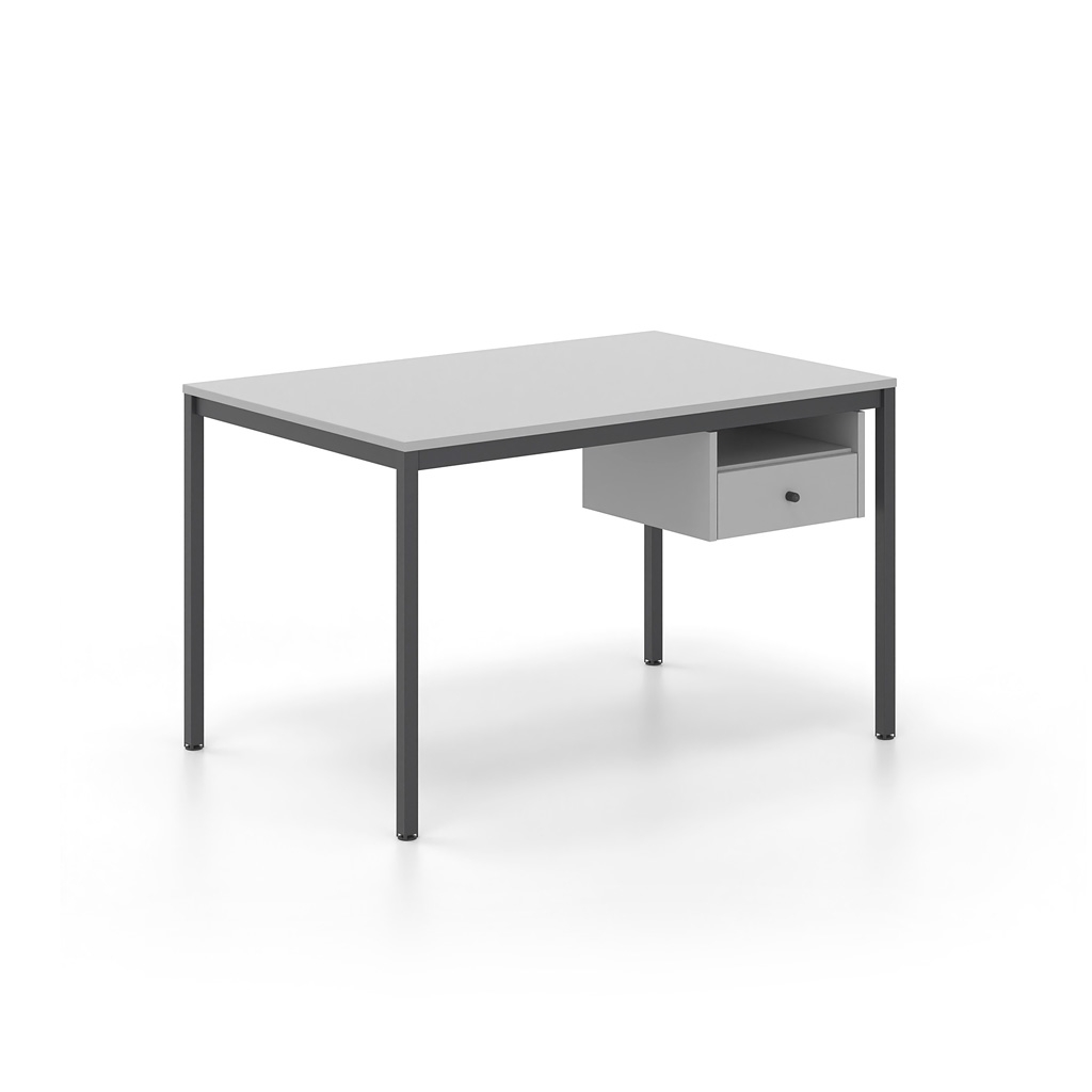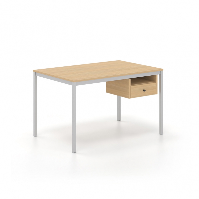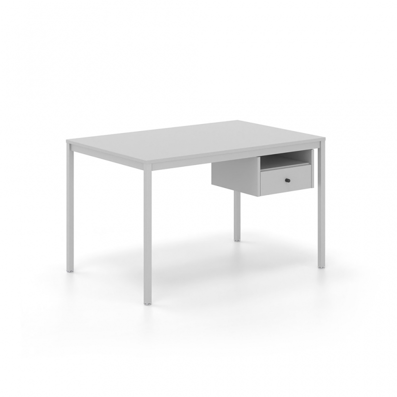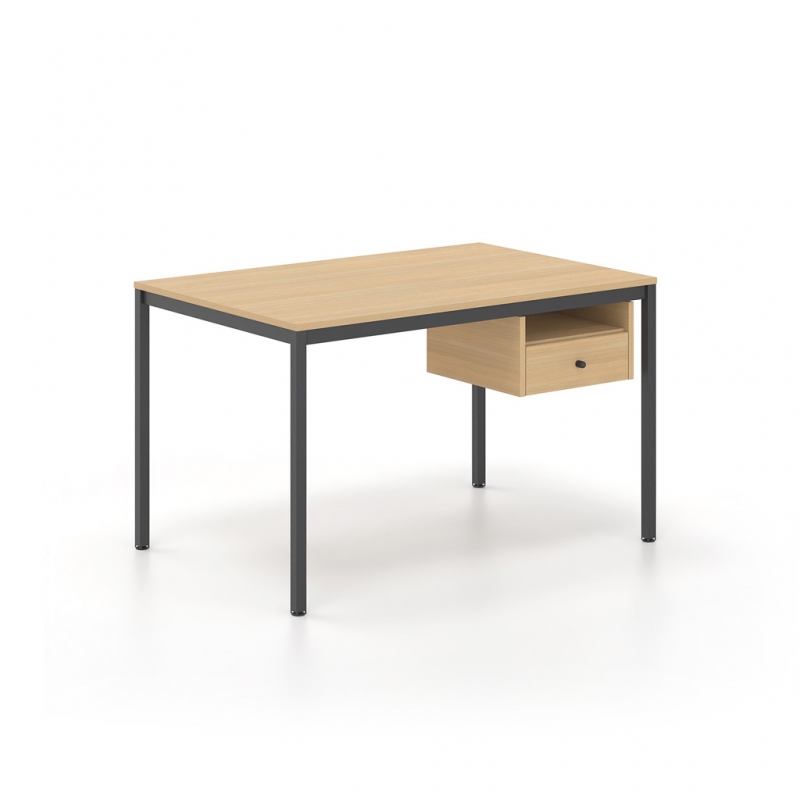 The THALES desk series includes chipboard desks with double-sided melamine coating and an electrostatically painted metal frame. The connection nodes between vertical and horizontal elements of the frame are made of cast aluminum alloy and are connected by an invisible clamping method. The 18 mm thick worktop is made of E1 melamine chipboard and has a 420 mm deep hanging drawer.