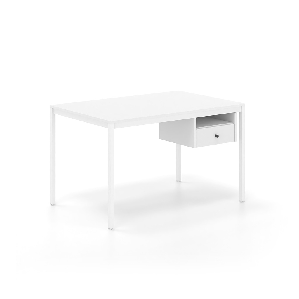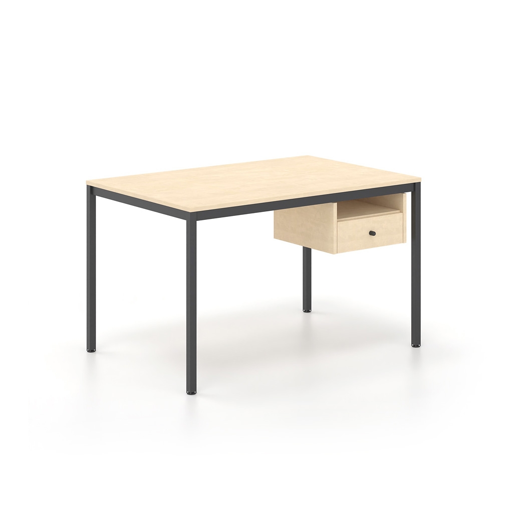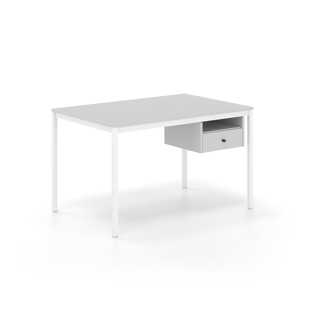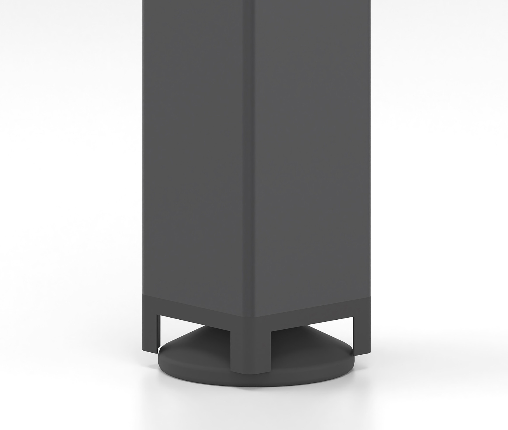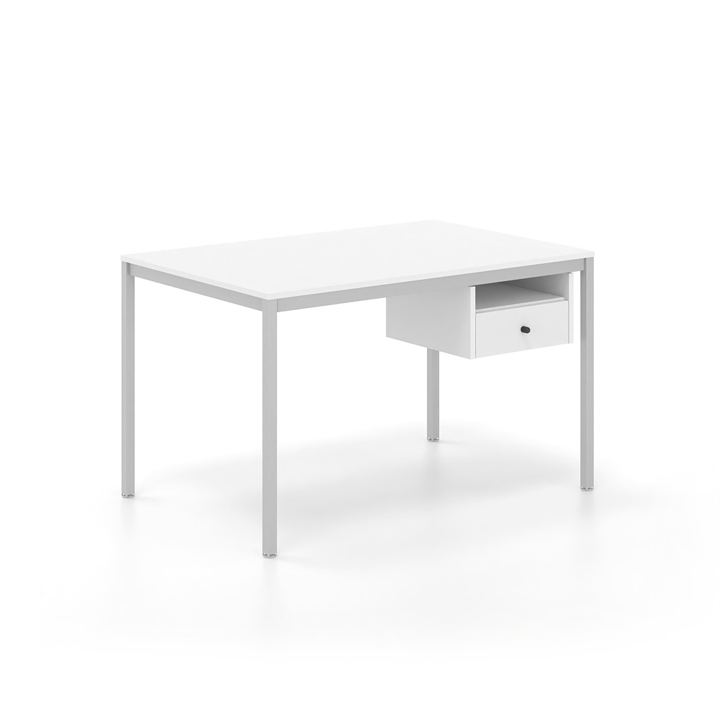 The THALES desk series includes chipboard desks with double-sided melamine coating and an electrostatically painted metal frame. The connection nodes between vertical and horizontal elements of the frame are made of cast aluminum alloy and are connected by an invisible clamping method. The 18 mm thick worktop is made of E1 melamine chipboard and has a 420 mm deep hanging drawer.