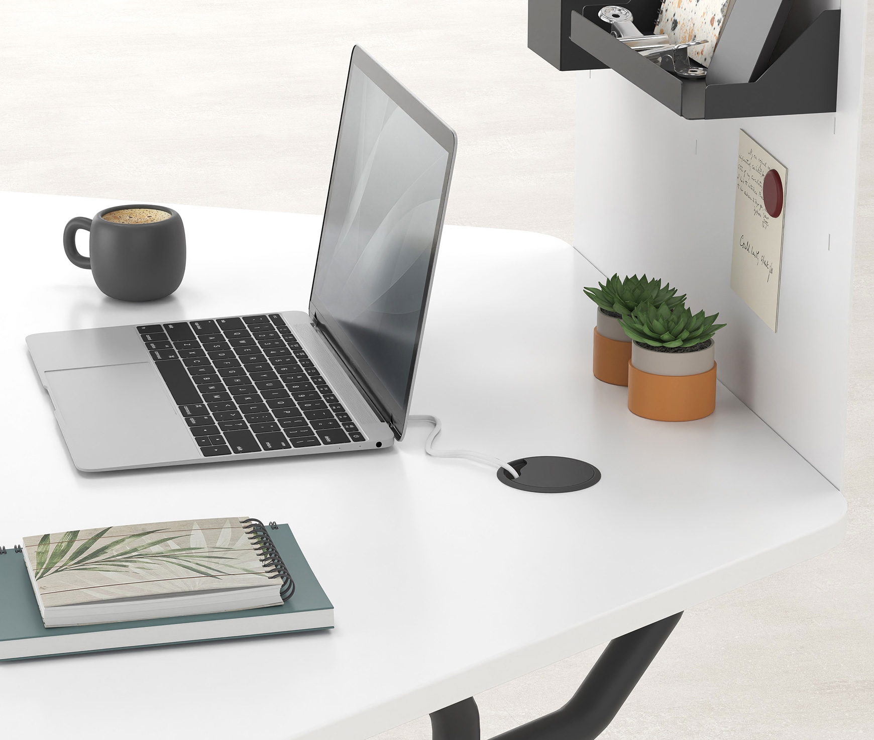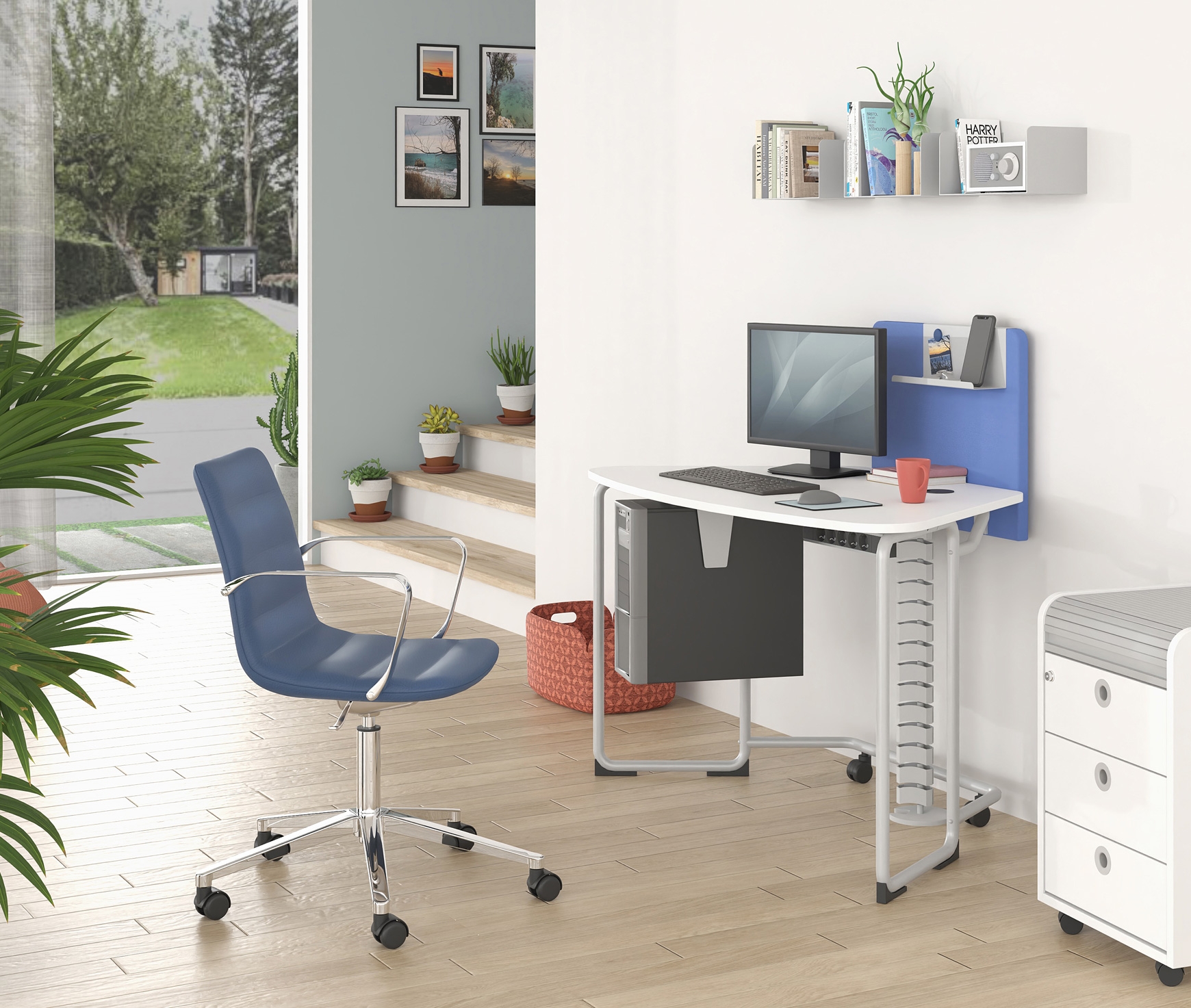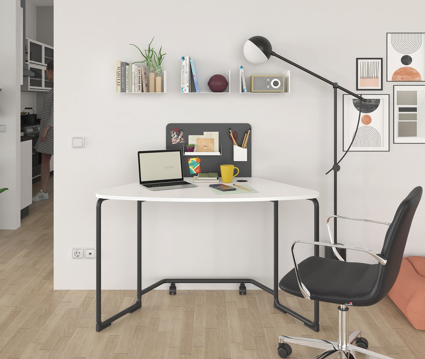Mobile office, inspired for working from home (home office), also suitable for small spaces. With smart equipment such as a partition wall, a PC stand, a power strip and a built-in rosette, you can create a stylish and highly organized space, perfect for working from home! Unassembled it takes up extremely little space and assembly is quick and easy.