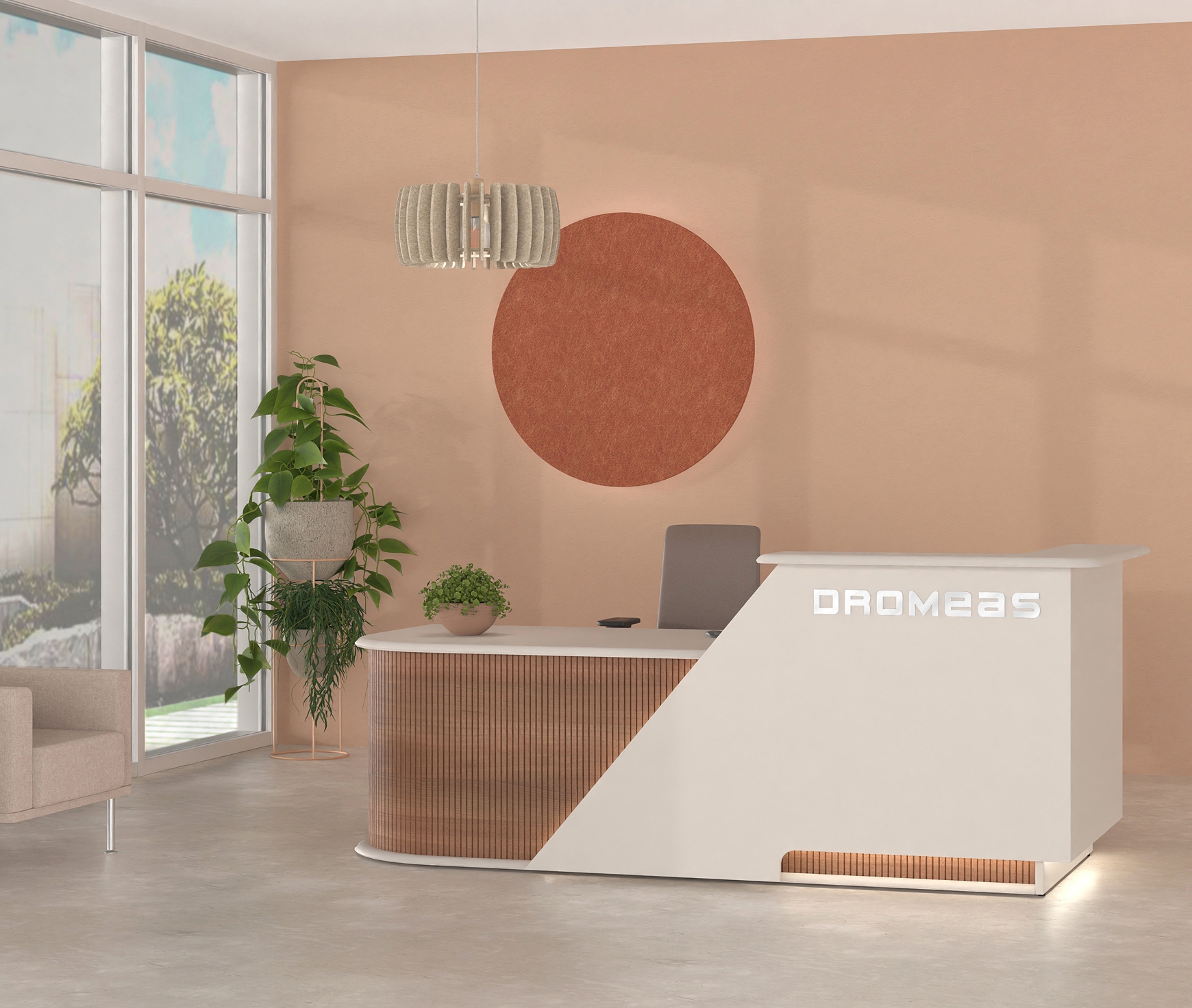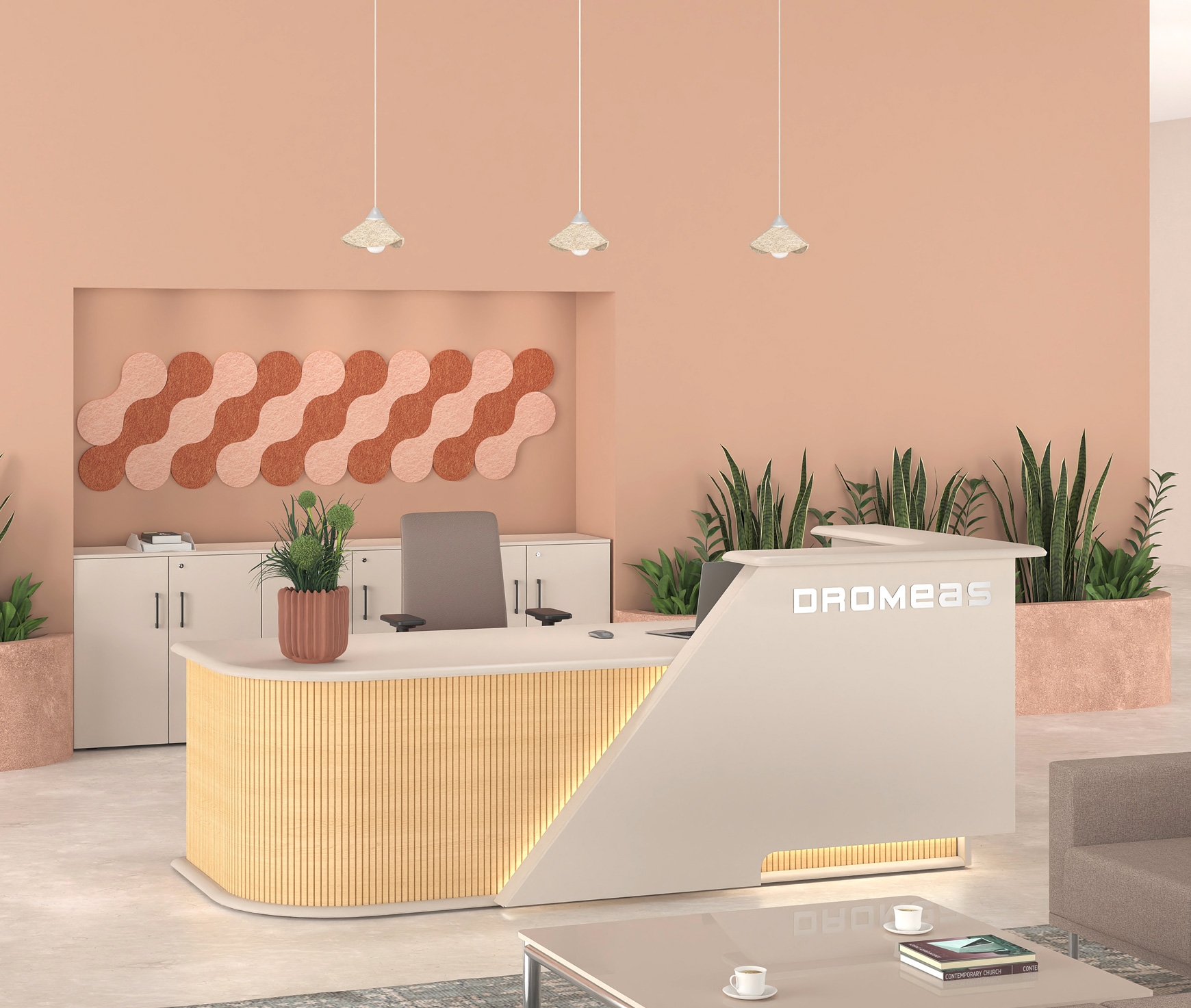 The new CALYPSO reception desk by DROMEAS blends minimalism with refined luxury. The harmonious balance between matte surfaces and natural wood creates a welcoming atmosphere, while the clean lines and integrated LED lighting exude elegance and design excellence. Calypso transforms every reception area into an experience of aesthetics and functionality.