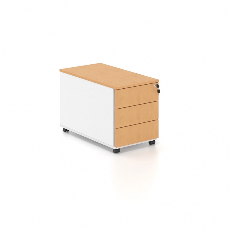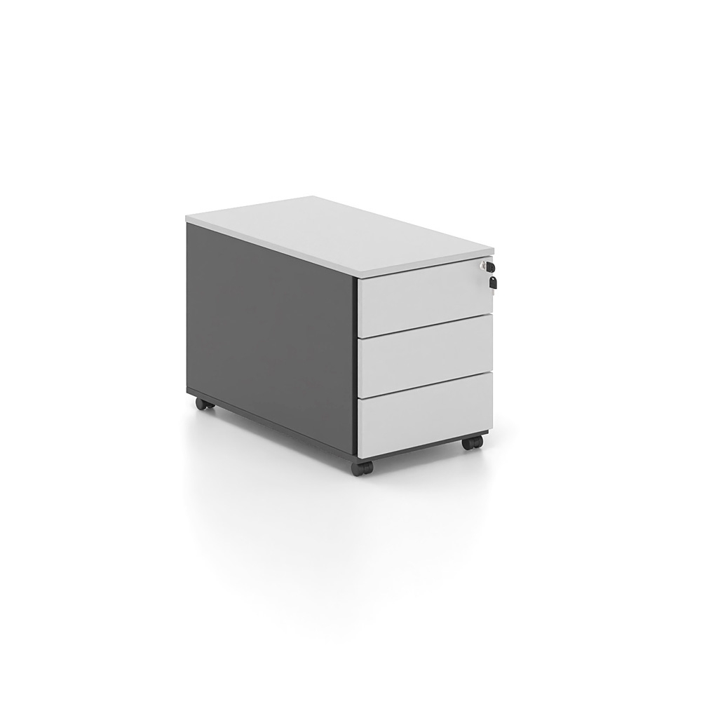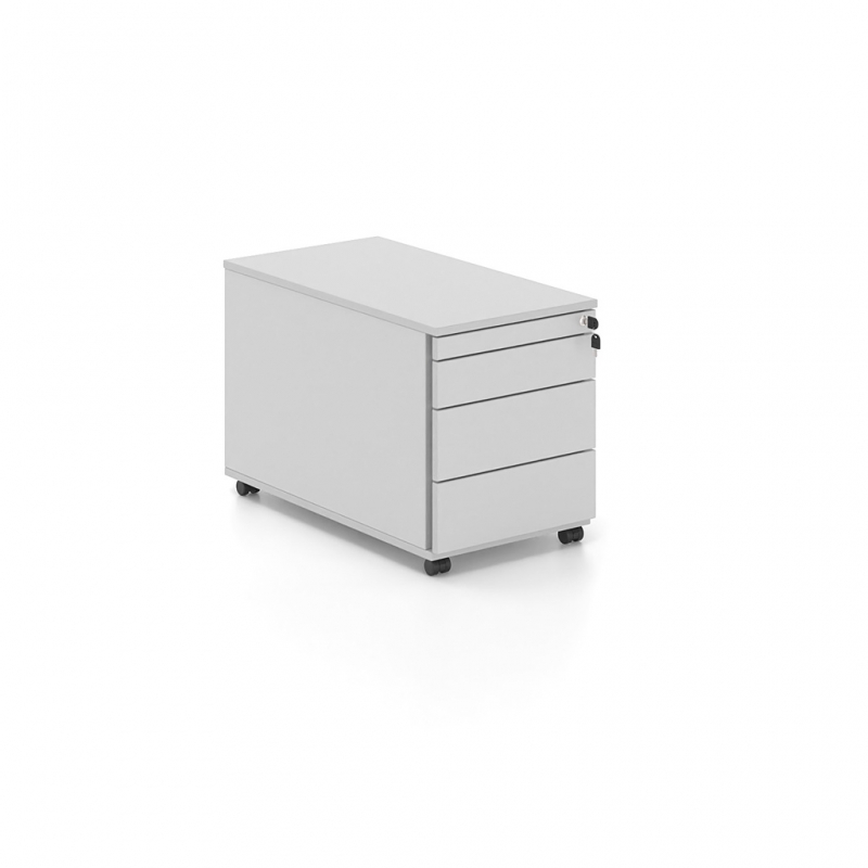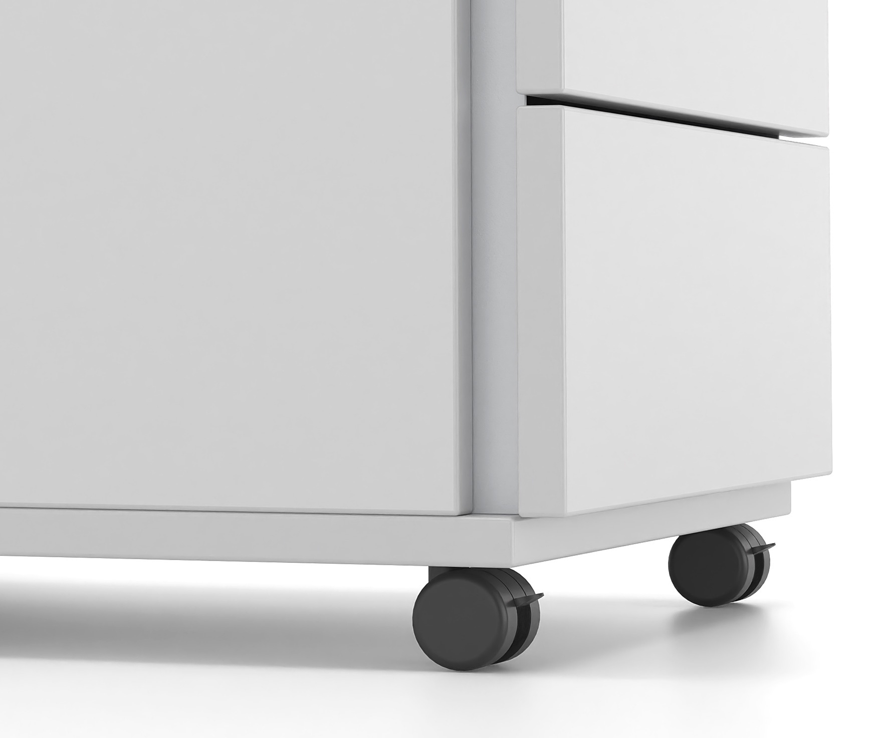 Pedestals made of melamine chipboard of high aesthetics and functionality. They are available in two depths of 60 cm and 80 cm. The pedestals are available on castors or fixed with sliders. In the case of castors, there is the option of adding wheels with brakes. They have metal drawers with hidden sliding guides and full (100%) opening, an antitilt system (does not allow opening more than one drawer), as well as a "soft close" closing damping system. All pedestals are equipped with safety locks. At the same time, the drawers have a suitable configuration so that it is possible to add transverse partition walls with a variable position for better organization of the storage space. They are available in a wide variety of colors.