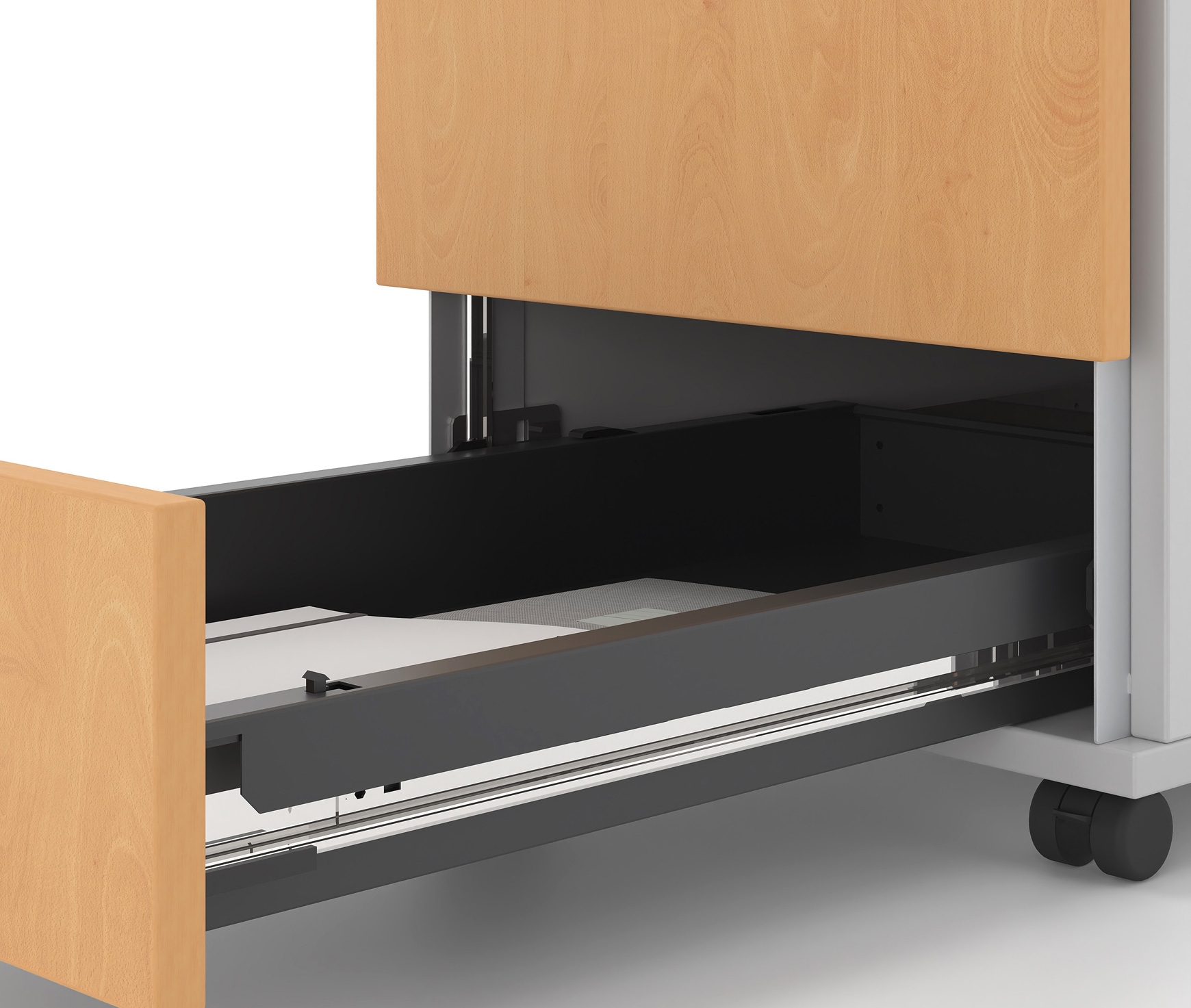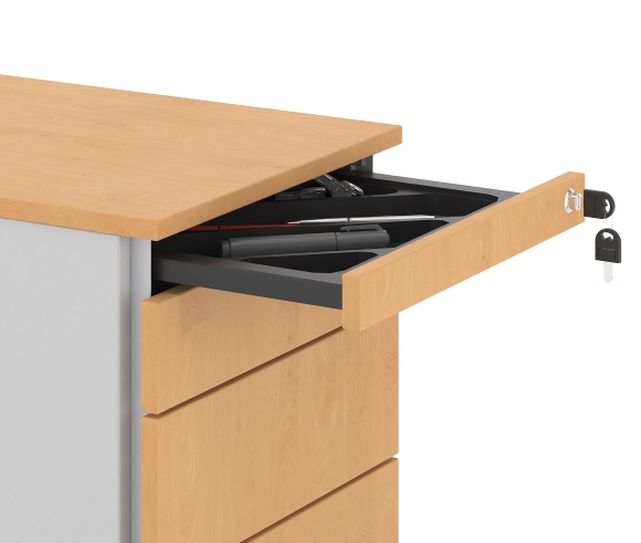 FUNCTIONALITY AND SECURITY – The option of a pencil holder, drawers, card holder and variable position dividers within the drawers makes it easy to organize the workspace. At the same time, the anti-tilt and soft close systems contribute to safety during work
