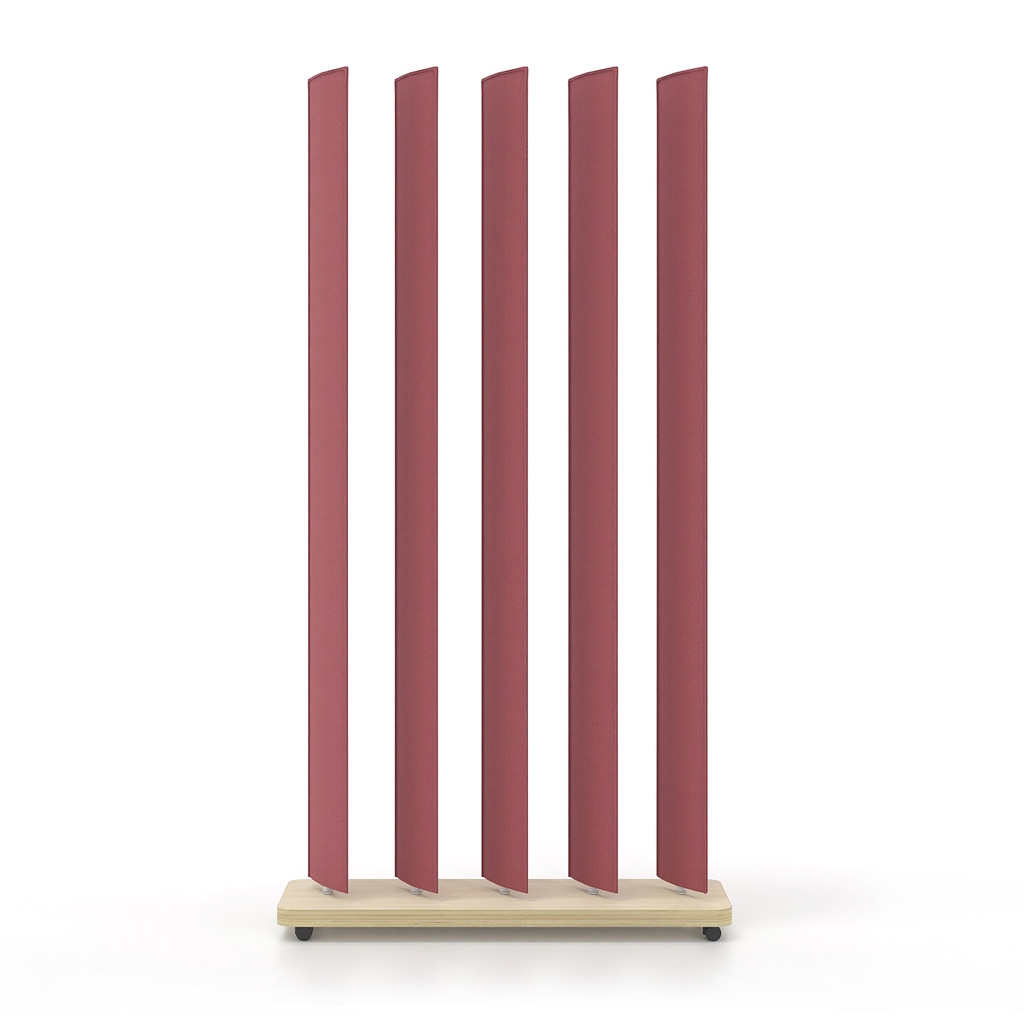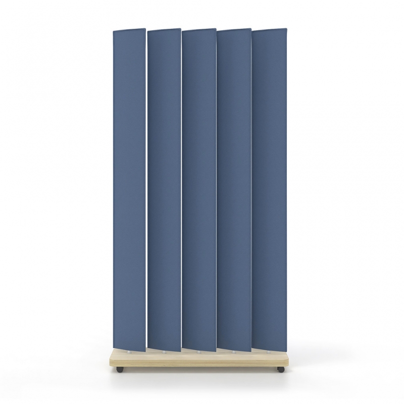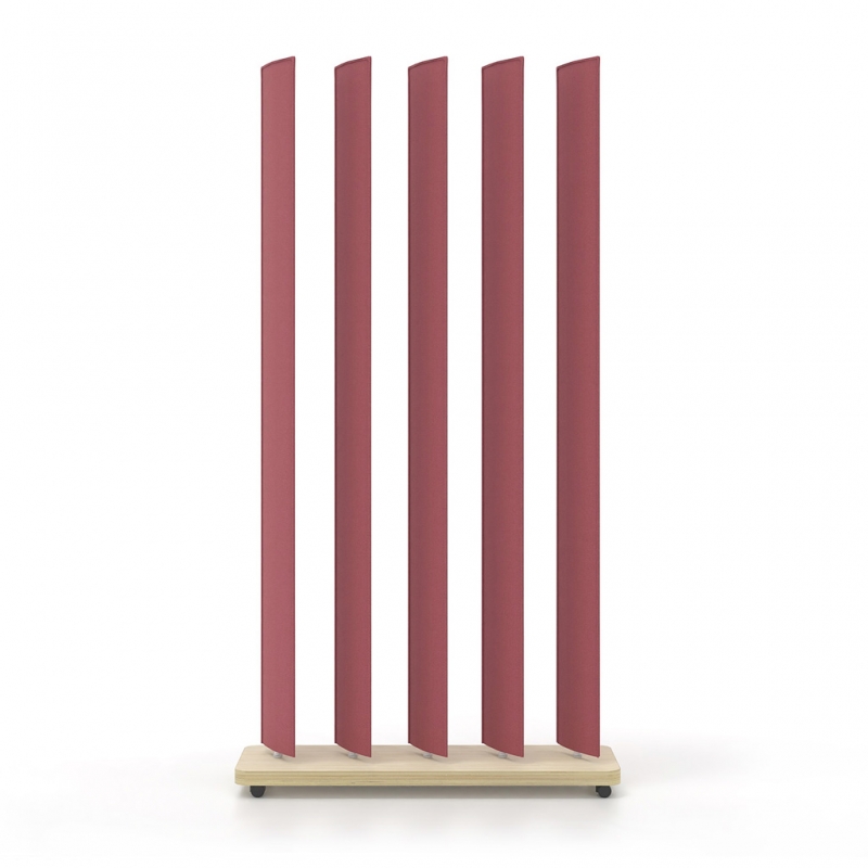 It consists of two parts, the base made of 35 mm thick laminated material, varnished with transparent varnish and integrated wheels. At the top are placed five specially shaped, coated rotating elements, made of sound-absorbing materials.