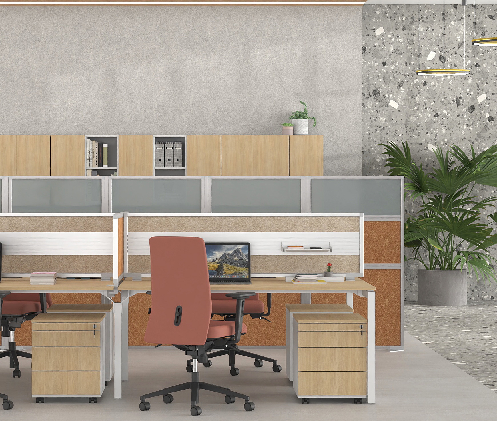 FLEXI PET desk-mounted screens combine contemporary aesthetics, functionality, and sustainability, offering flexible solutions for zoning and organizing the workspace. Thanks to the wide range of configurations in dimensions, materials, and colors, they adapt seamlessly to any professional environment, while significantly enhancing acoustic comfort and visual privacy.
