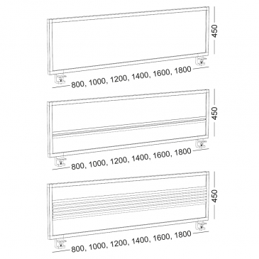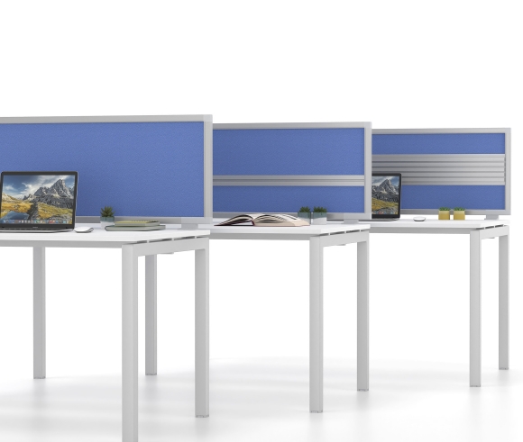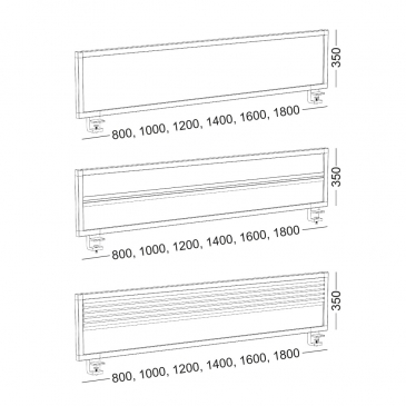 The tabletop partitions are available in heights of 350 and 450 mm and are fixed to the desk surface by means of die-cast aluminum connectors. They can be connected to each other in the shape of a cross, T or even in a straight line. Optionally, it is possible to support auxiliary desk accessories, such as e.g. monitor arms. Suspended dividers accept E1 chipboard curtains with melamine or fabric lining, clear glass or chemical sandblasting.