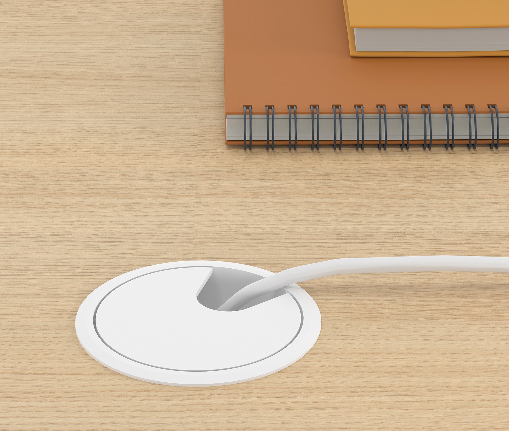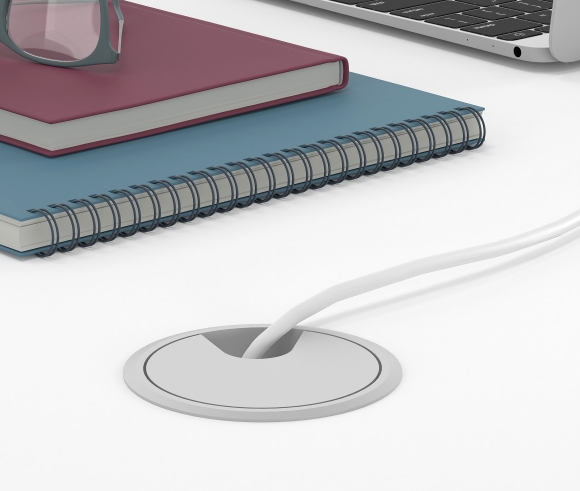 The metal cable entry rosette is placed in a suitable 79 mm diameter hole in the work surface. It is particularly useful for securely connecting devices as well as hiding cables.