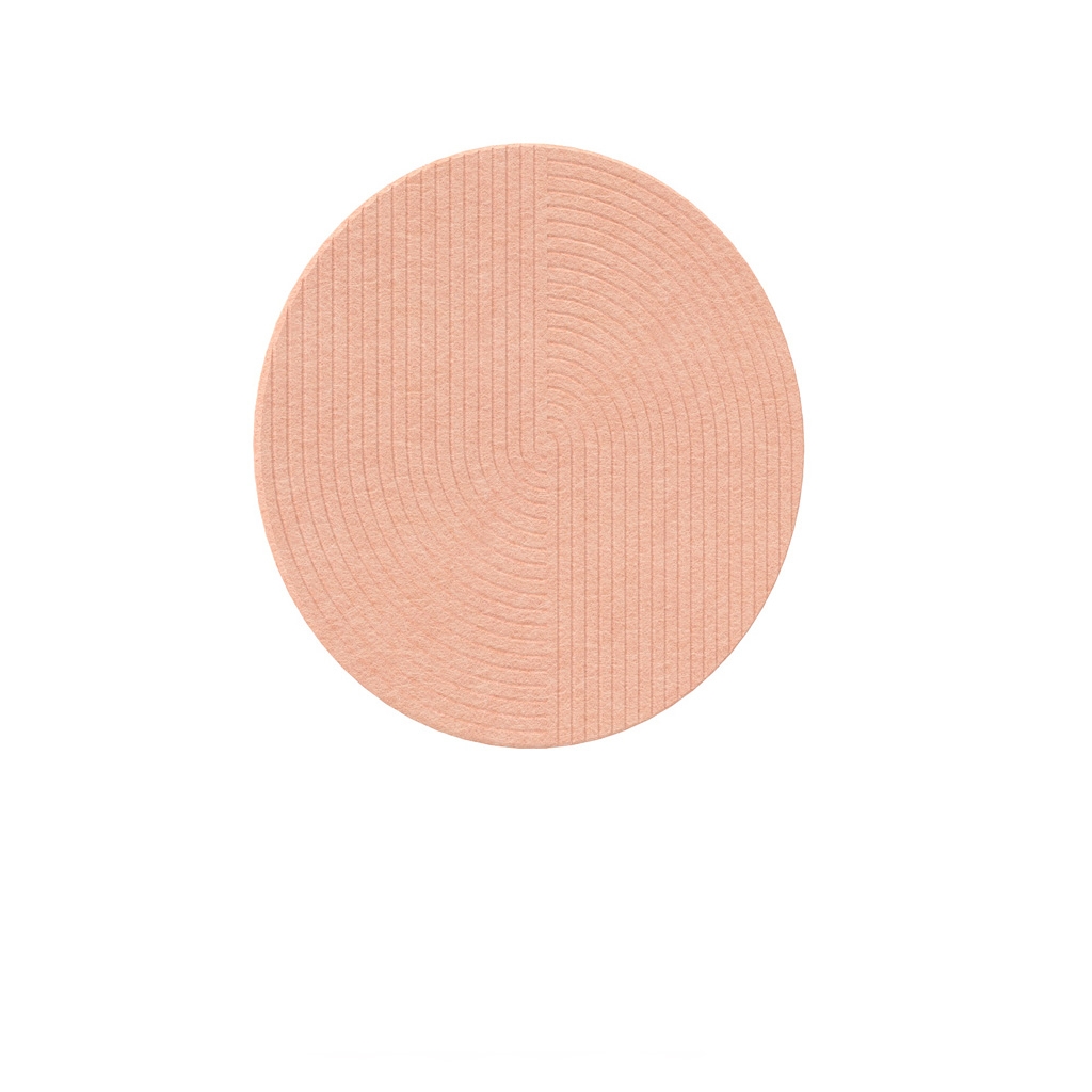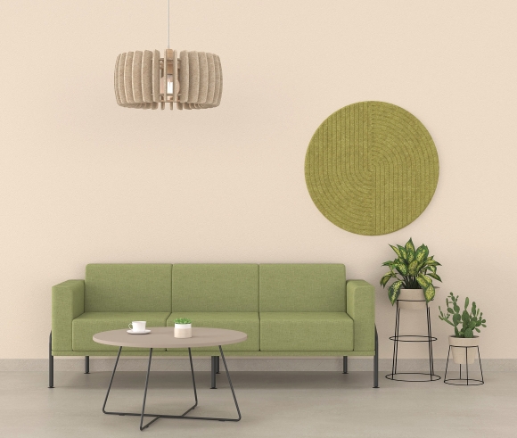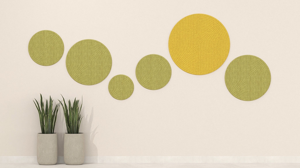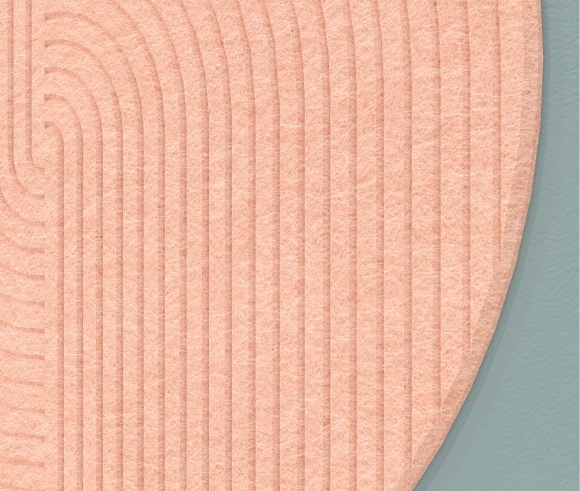 Wall-mounted acoustic panels are available in rectangular, square, and round shapes. They have a thickness of 18mm and are made from 100% PET felt (60% recycled PET fibers + 40% virgin PET fibers), a material with excellent sound-absorbing properties. Wall installation is achieved using suitable mounting materials or, alternatively, on the ceiling with a dedicated suspension system.