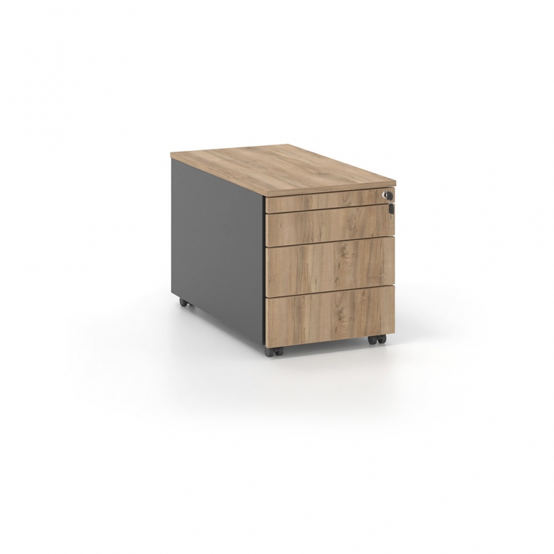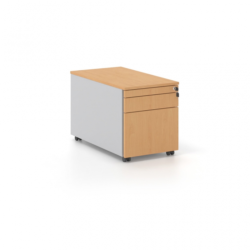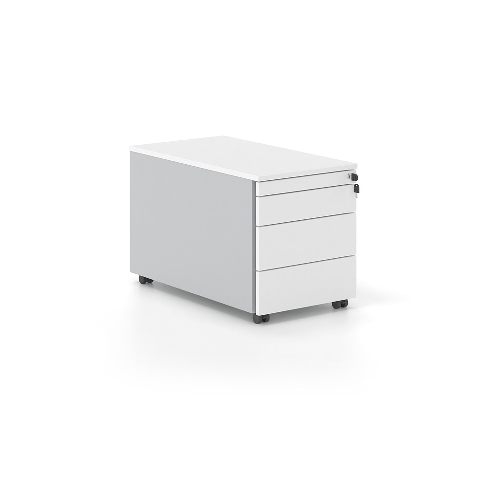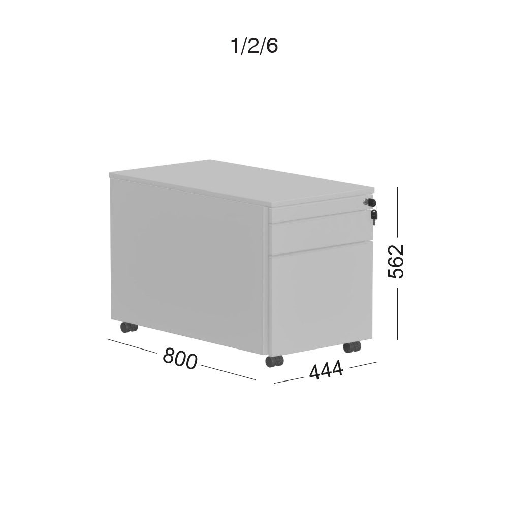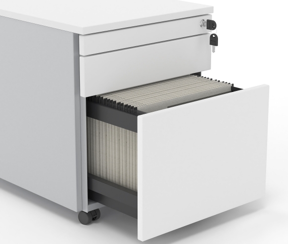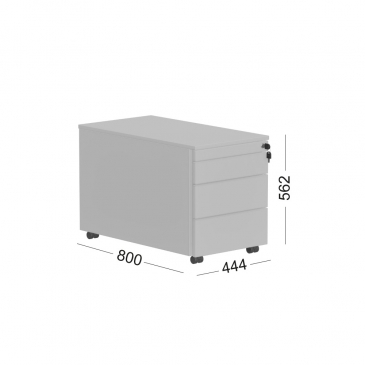 Pedestals made of metal casing, of high quality and aesthetics. They are equipped with a decorative lid and melamine chipboard trays in a wide variety of colors. It is available with a depth of 80 cm. The pedestals are available on castors or fixed with sliders. In the case of castors, there is the option of adding wheels with brakes. They have metal drawers with hidden sliding guides and full (100%) opening, an antitilt system (does not allow opening more than one drawer), as well as a "soft close" closing damping system. All pedestals are equipped with safety locks. At the same time, the drawers have a suitable configuration so that it is possible to add transverse partition walls with a variable position for better organization of the storage space. They are available in a wide variety of colors.