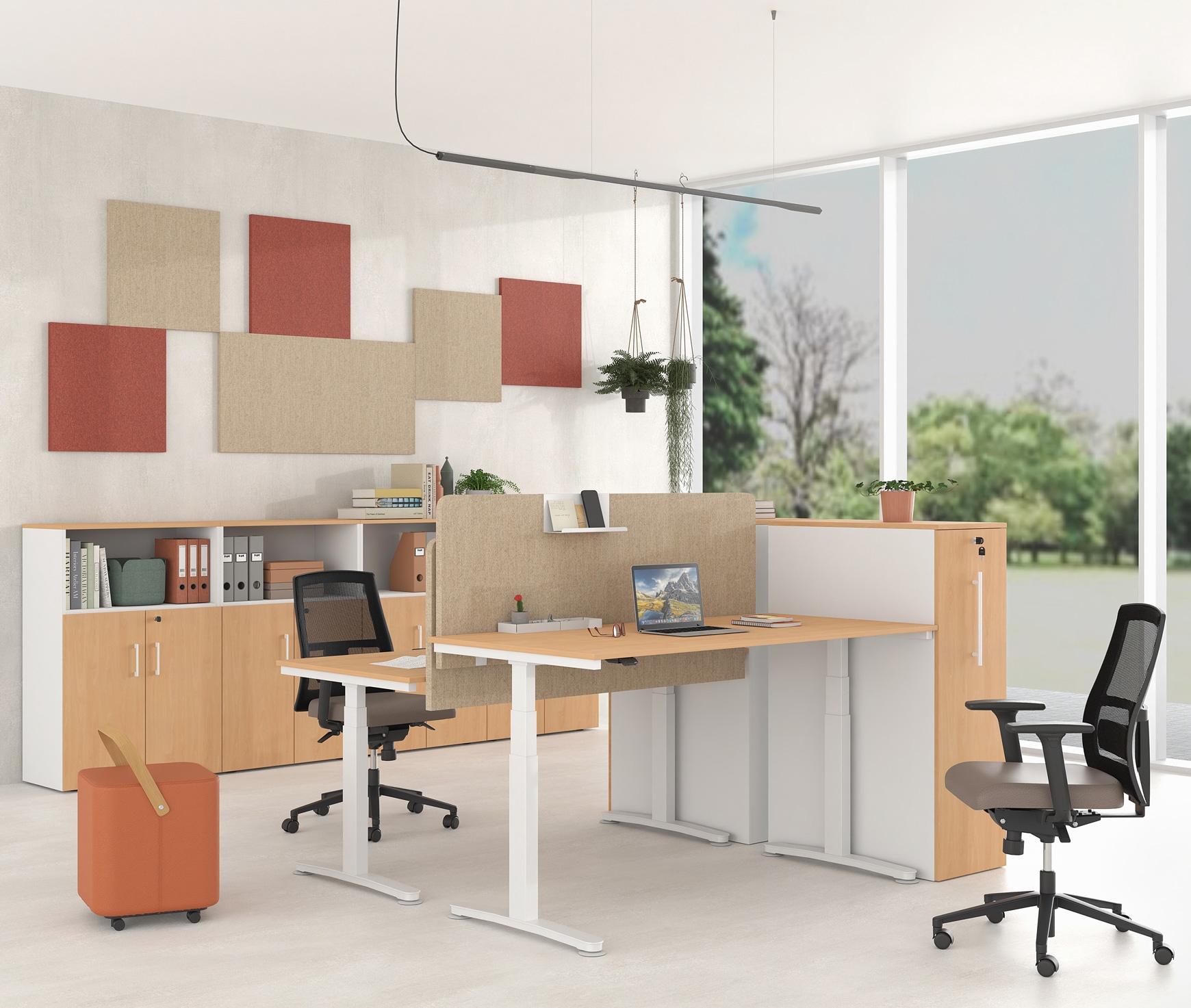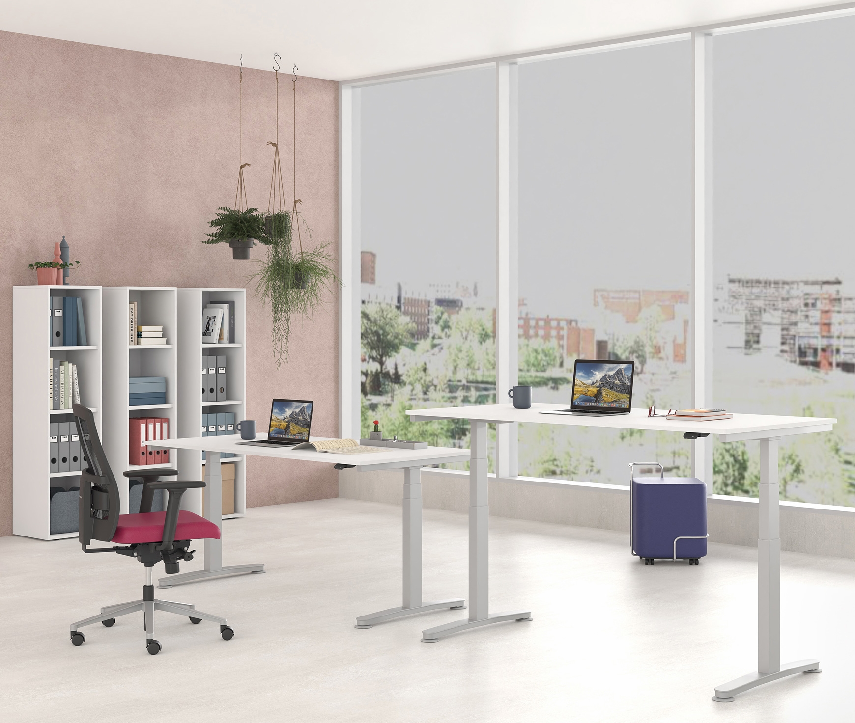 Improve health and well-being during work – studies have shown that being able to switch between standing and sitting positions significantly reduces fatigue, pain and back problems. Like all mechanical systems, the human body obeys physical laws. In the standing position, the load is shared between the ligaments of the vertebrae, in the sitting position the intervertebral discs bear the greatest load. Designing workplaces with a variety of postures and mobility is one way to deal with harmful sedentary lifestyles