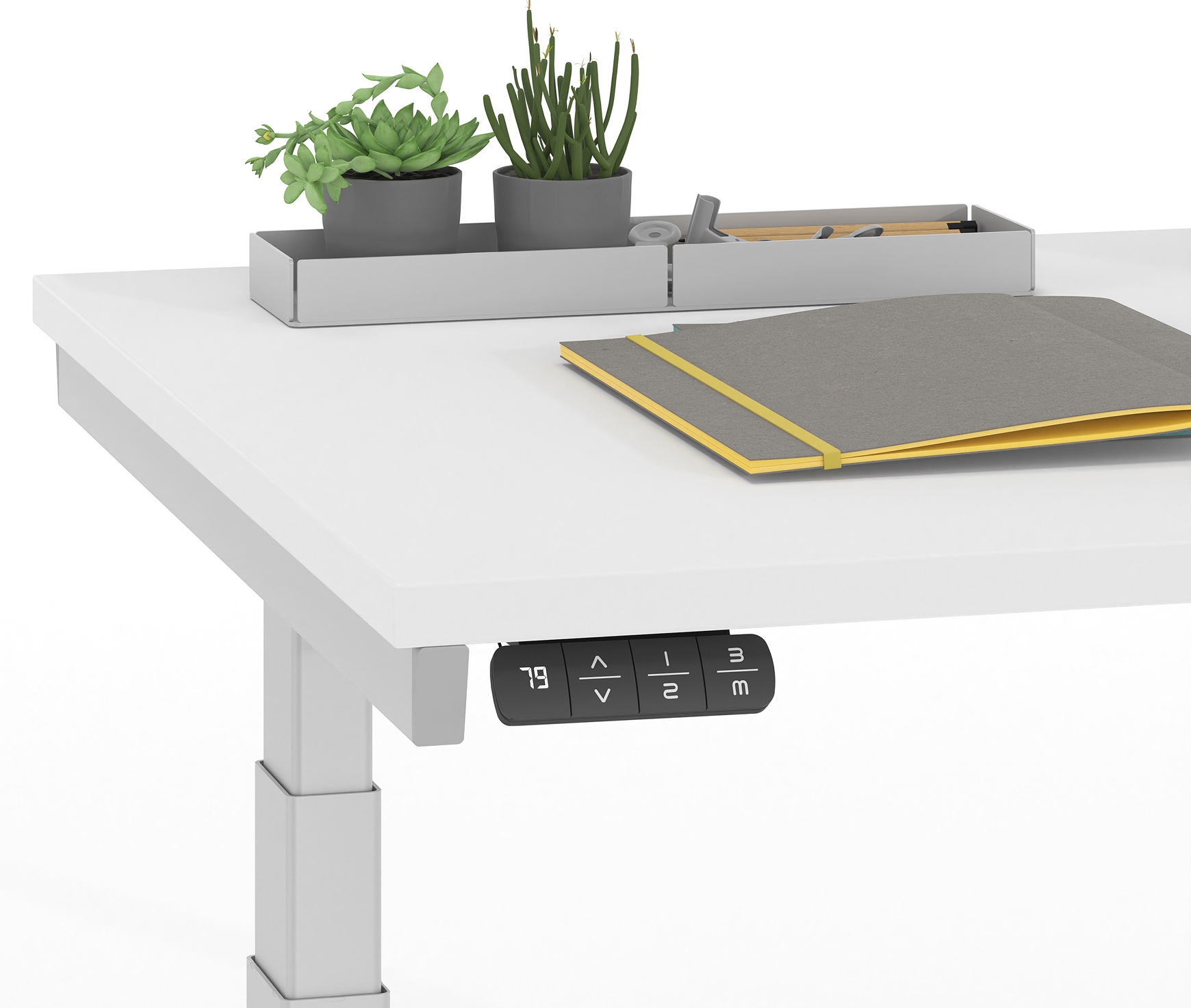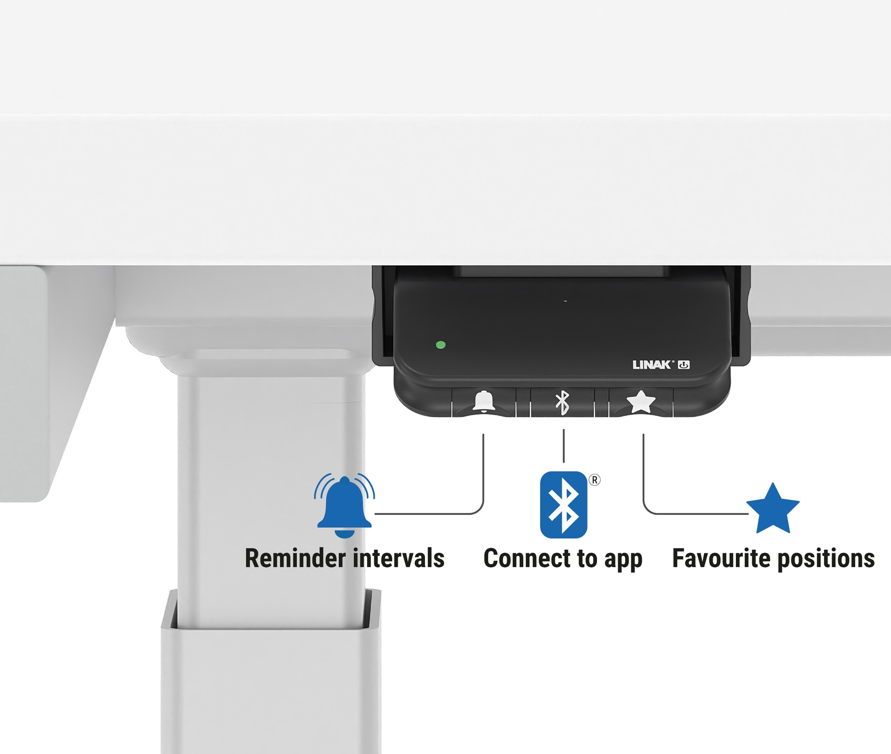 BLUETOOTH CONTROLLER IOS/ANDROID/DESKTOP CONNECTIVITY – Bluetooth wireless connection allows for remote control of the desk, useful statistics as well as programming of smart visual alerts for switching between standing and sitting work positions