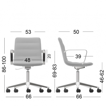An elegant and comfortable visitor’s chair proposal! VALUE has a single, height-adjustable, rotating frame upholstered in fabric or leatherette. The elegant effect is completed by the five-star, polished aluminum base and the nickel-plated support arms