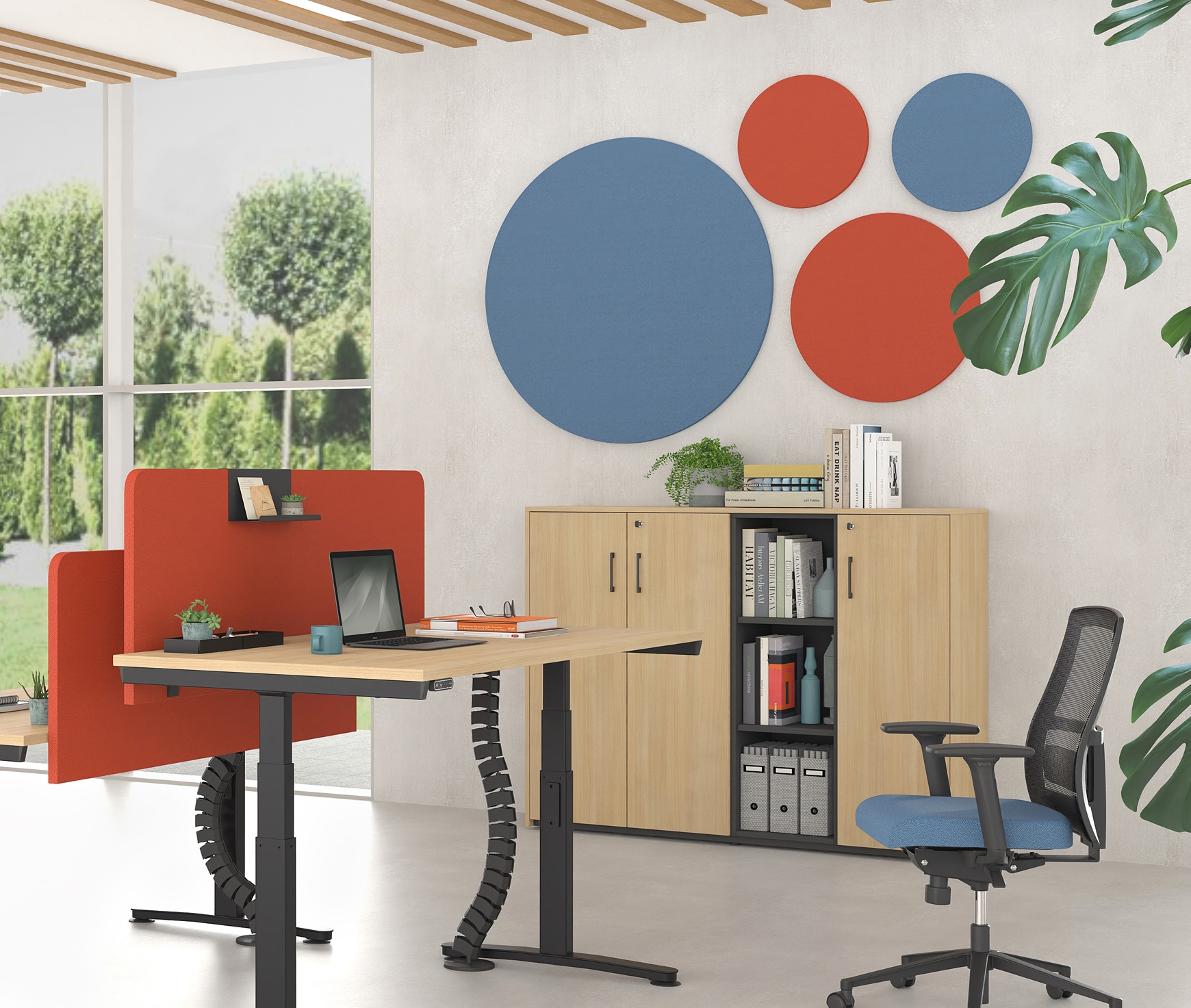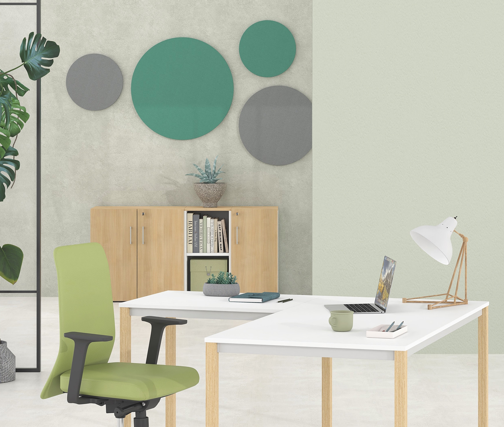 Wall-mounted acoustic panels are available in rectangular, square, and round shapes. They have a thickness of 18mm and are made from 100% PET felt (60% recycled PET fibers + 40% virgin PET fibers), a material with excellent sound-absorbing properties. Wall installation is achieved using suitable mounting materials or, alternatively, on the ceiling with a dedicated suspension system.