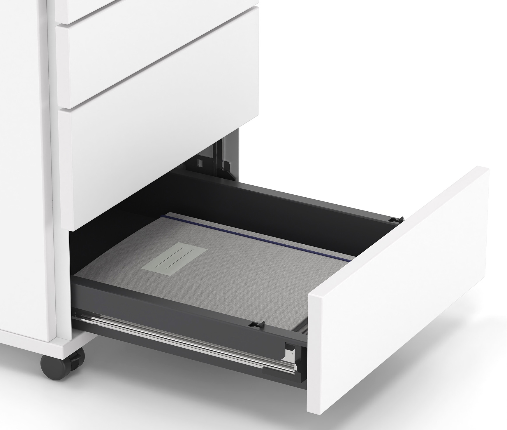 FUNCTIONALITY AND SECURITY – The option of a pencil holder, drawers, card holder and variable position dividers within the drawers makes it easy to organize the workspace. At the same time, the anti-tilt and soft close systems contribute to safety during work