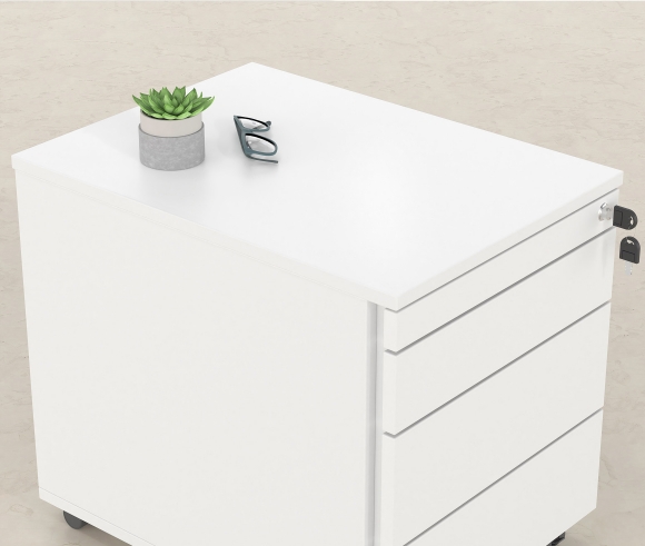 MDF pedestals with lacquer coating of high aesthetics and functionality. They are available in depths of 58.9 cm, 60 cm and 80 cm. The pedestals are available on castors or fixed with sliders. In the case of castors, there is the option of adding wheels with brakes. They have metal drawers with hidden sliding guides and full (100%) opening, an antitilt system (does not allow opening more than one drawer), as well as a "soft close" closing damping system. All pedestals are equipped with safety locks. At the same time, the drawers have a suitable configuration so that it is possible to add transverse partition walls with a variable position for better organization of the storage space. They are available in a wide variety of colors.