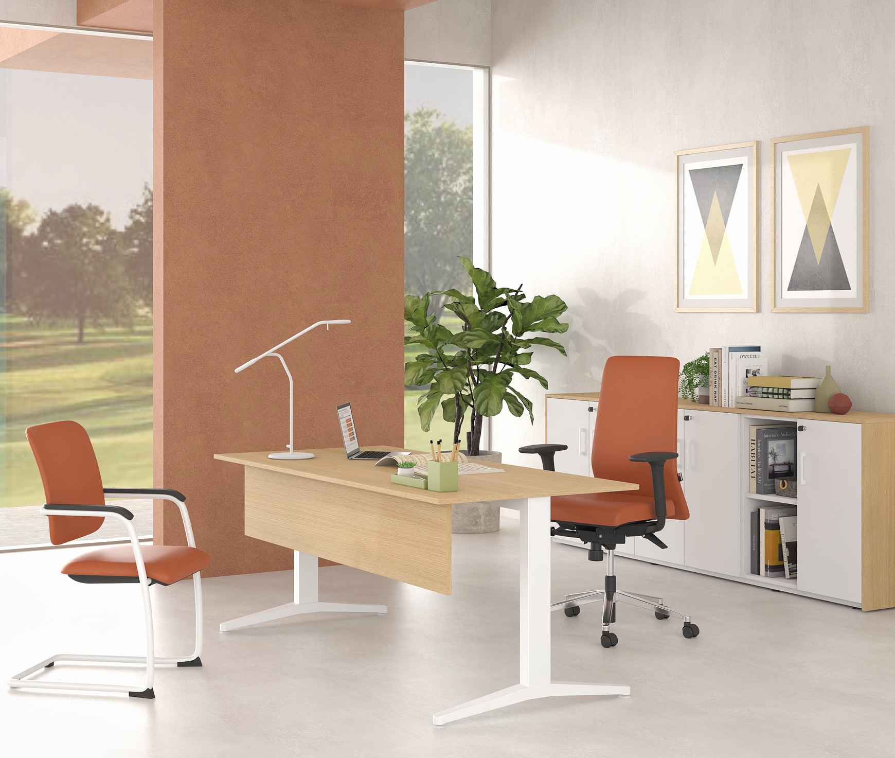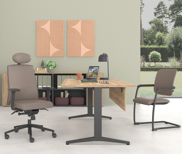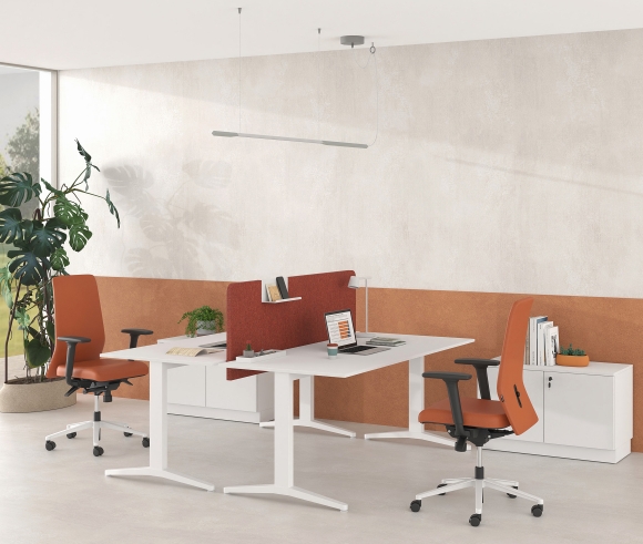 The ALMA desk series has been enriched with design solutions and proposals that meet today's needs for flexibility and ergonomics in the modern workplace. The main feature of the ALMA S series desks is the robust construction and elegance, thanks to the symmetrical vertical T-shaped supports.