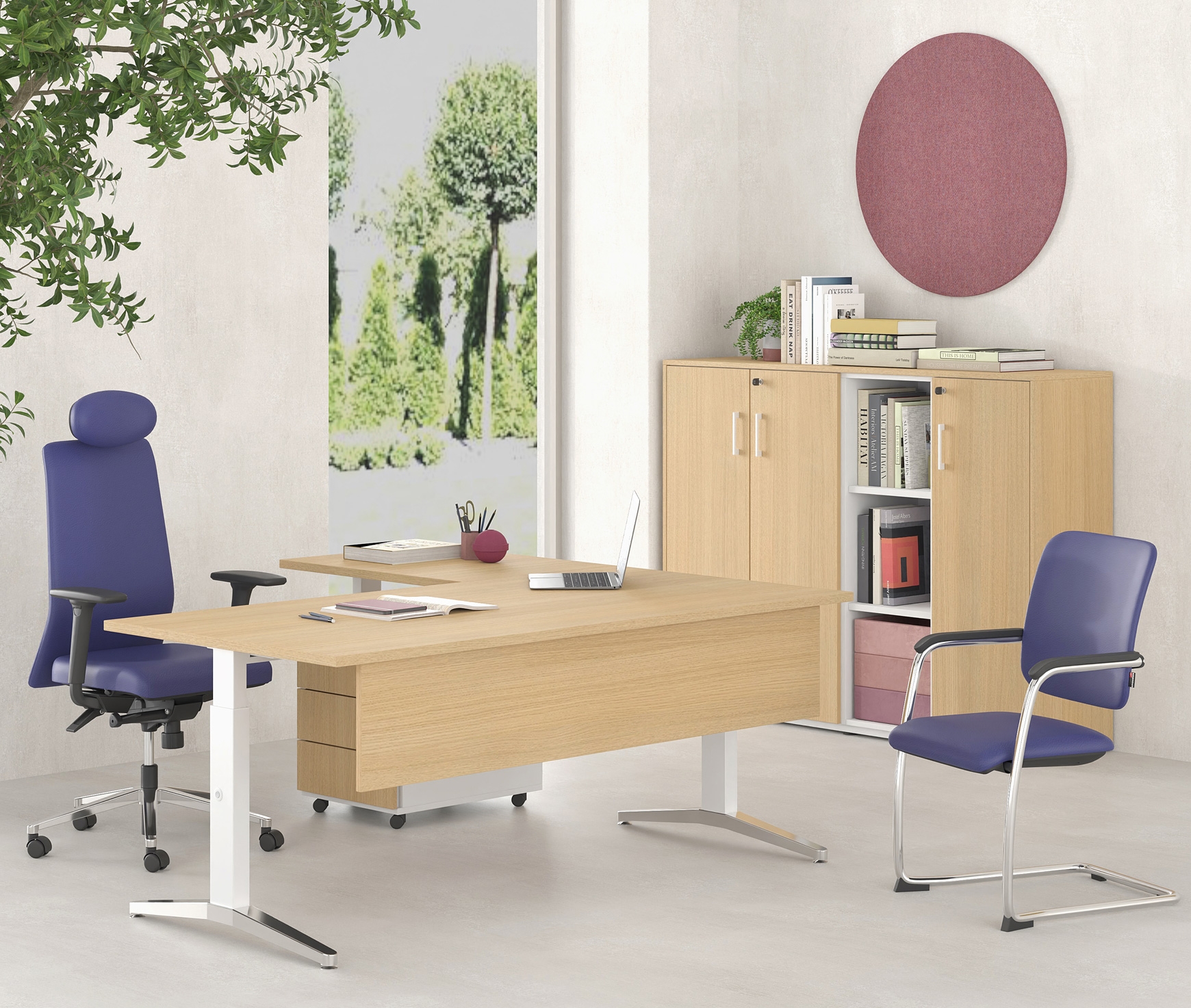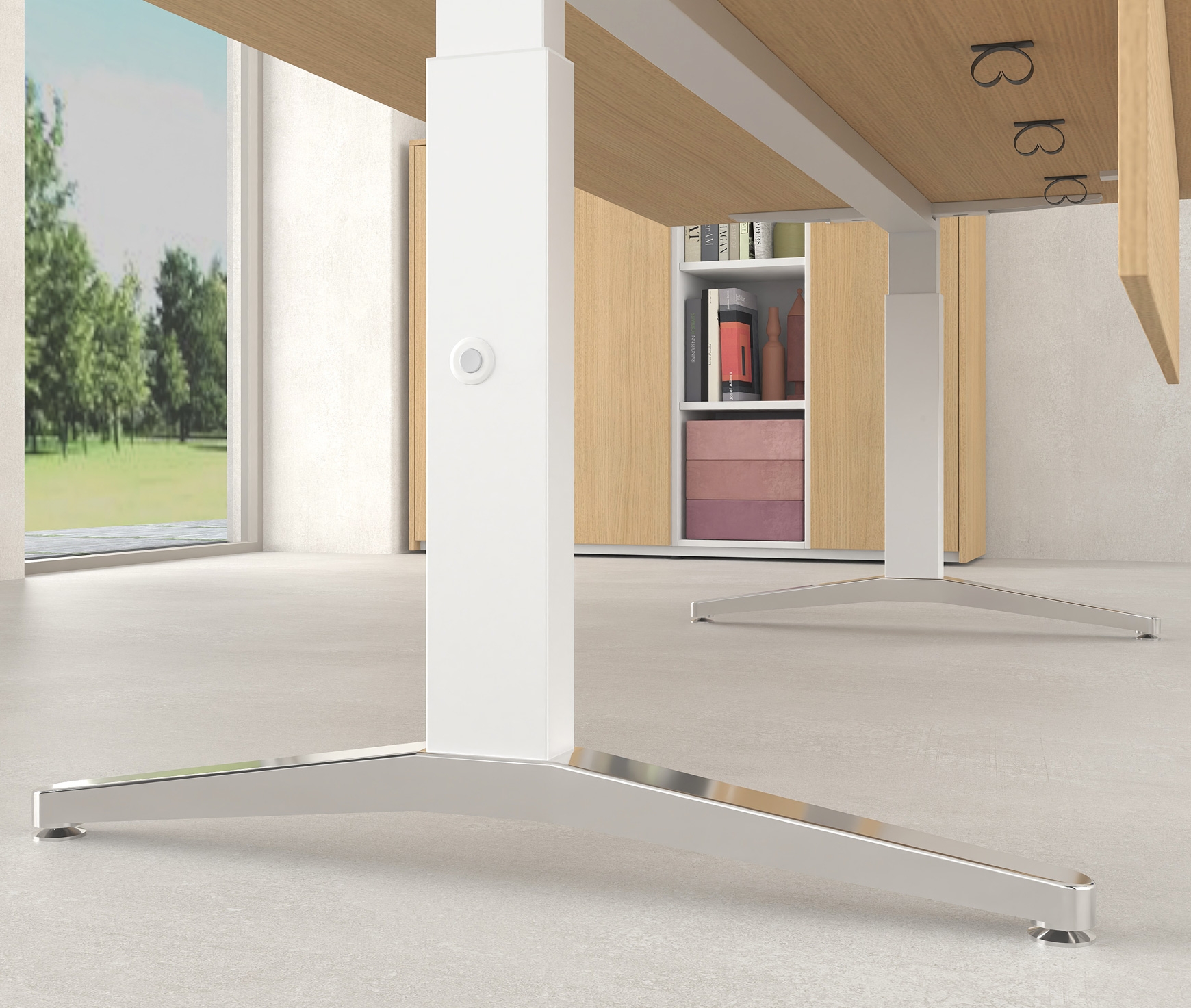 The ALMA desk series has been enriched with design solutions and proposals that meet today's needs for flexibility and ergonomics in the modern workplace. Thanks to the telescopic, metal, vertical T-shaped supports of the ALMA K series, the height adjustment of the desk is easily and quickly achieved.